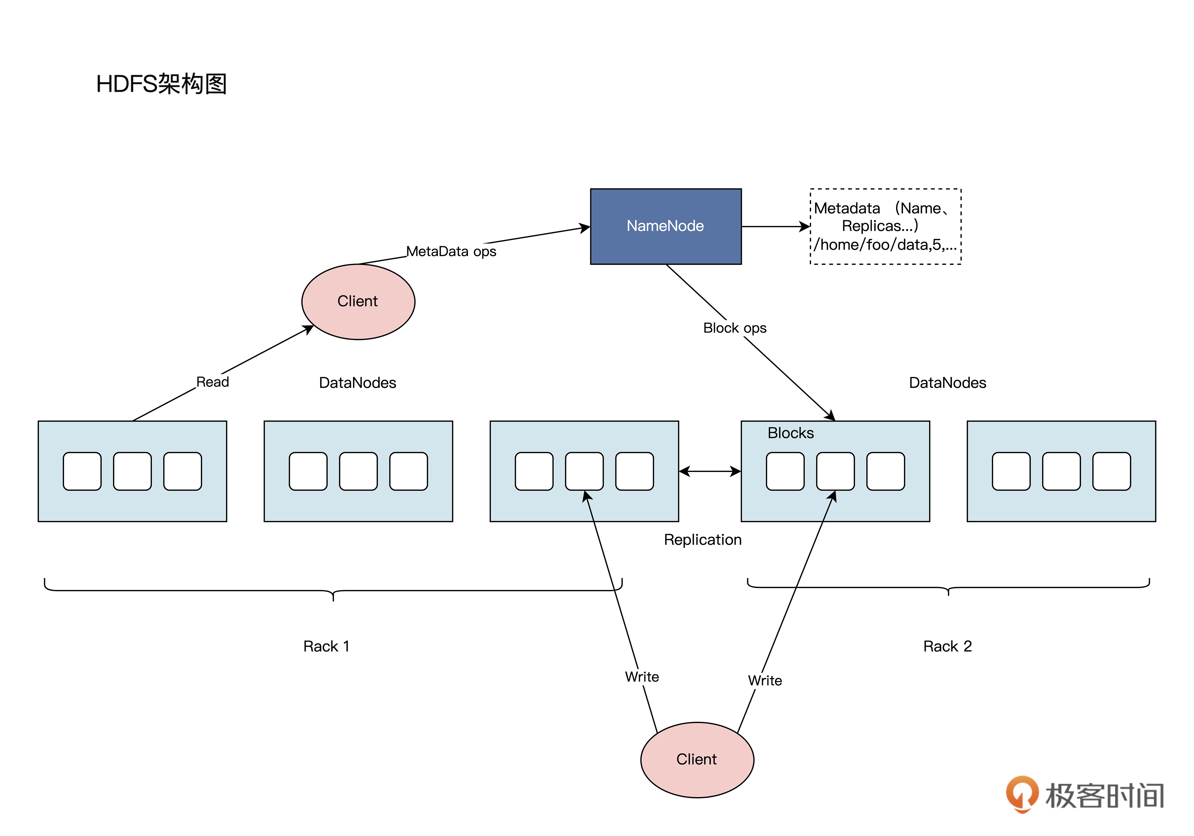 其实,HDFS的核心架构和[上节课]讲过的GFS,架构思路是一脉相承的。