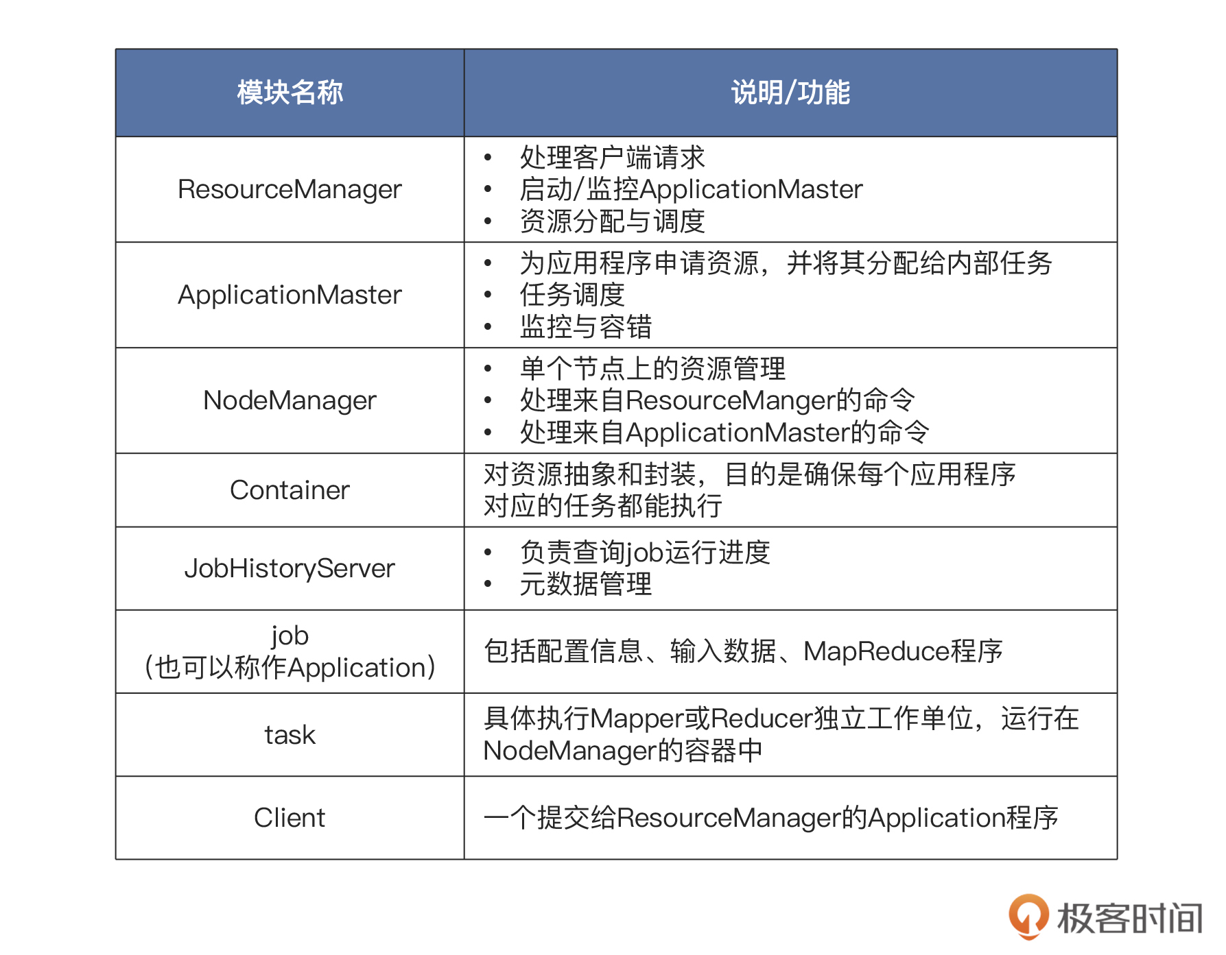 YARN的架构图中的各个模块的功能,你可以参考后面这张表格:-
