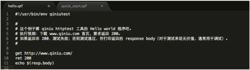 上图是这套 DSL 的 “hello world” 程序。它的执行预期是:下载 www.qiniu.com 首页,要求返回的 HTTP 状态码为 200。如果返回非 200,测试失败;否则测试通过,输出返回包的正文内容(resp.body 变量)。输出 resp.body 的内容通常是调试需要,而不是测试需要。自动化测试是不需要向屏幕去输出什么的。
