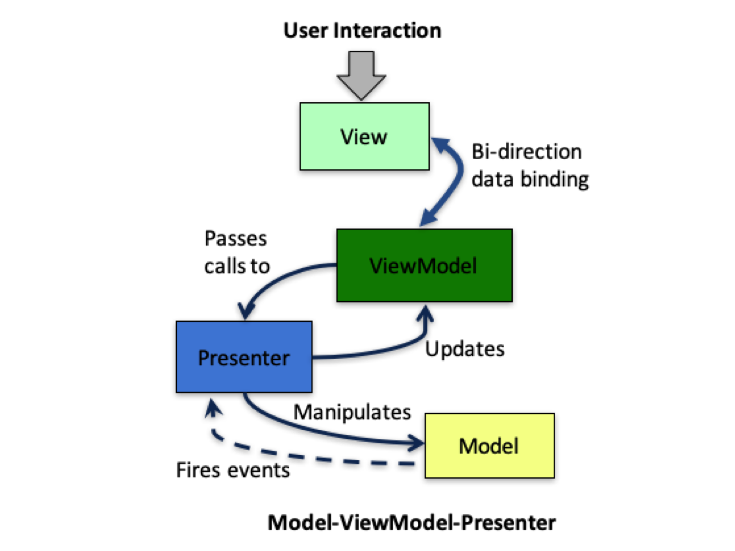 这个时候我们重新看 MVC 框架在浏览器下的样子,你会发现它变成了 MVMP 模式,全称为 “Model-ViewModel-Presenter”。