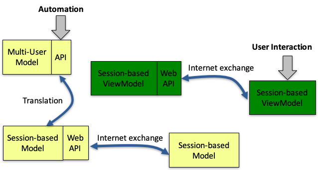 在图中,我们把服务端分成了两层。底层是 Multi-User Model 层,一般情况下它对外提供了一套 RESTful API 接口。上层是 Web 层,对外提供 Web API。Web 层又分为 Session-based Model 层和 Session-based ViewModel 层。