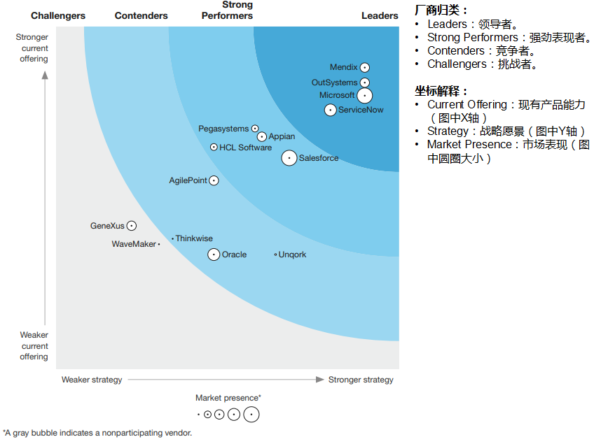 作为低代码的实现者,一般看这种报告都是以竞品调研为目的的,因此我们一般只研究 Leader 象限里的提供商就可以了。Leaders 这个象限显示的是技术能力较强、对未来的规划很清晰的厂商,其产品被市场广泛认可,对我们有极强的参考价值。