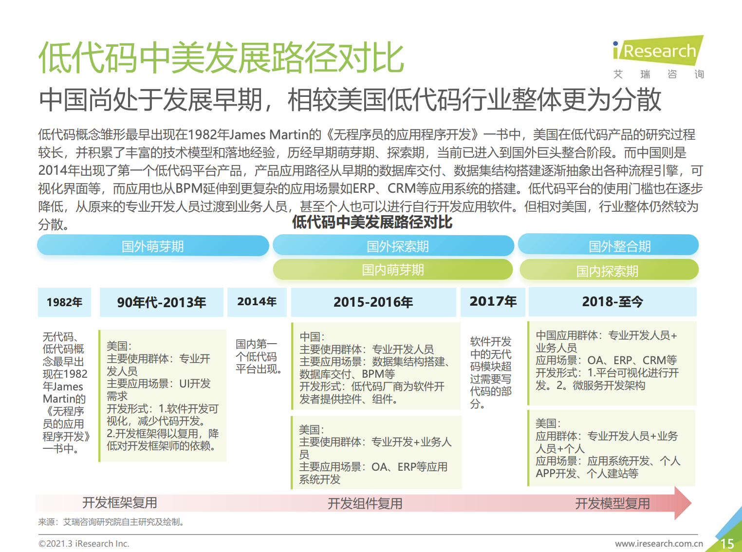 我们再换个角度,从时间和地域来看低代码的发展。下面这张来自艾瑞咨询的图片总结了这个过程,图中信息量比较大,你可以点开仔细阅读。