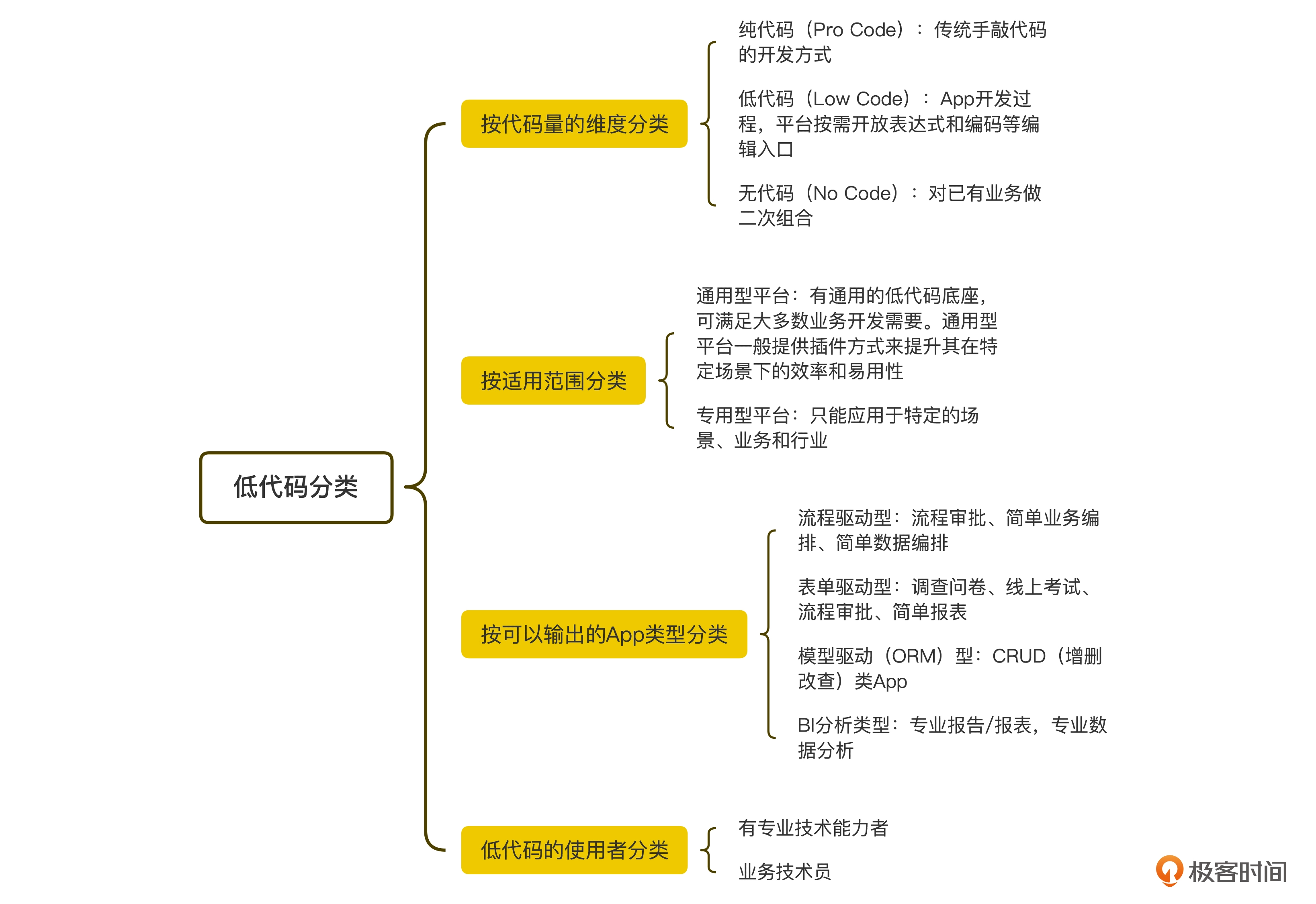 但要对低代码做分类,并不容易。由于低代码概念和内涵未达成一致,业界对它进行归类的方式也多种多样。这里,我以我理解的低代码的几个重要特征作为维度,对低代码进行归类,同时你也能通过这些分析,了解我们这门课要实现的低代码平台到底是啥样的。