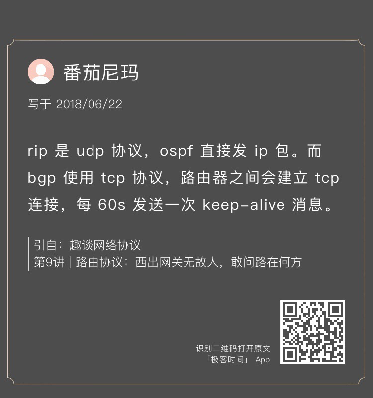 OSPF是直接基于IP协议发送的,而且OSPF的包都是发给邻居的,也即只有一跳,不会中间经过路由设备。BGP是基于TCP协议的,在BGP peer之间交换信息。