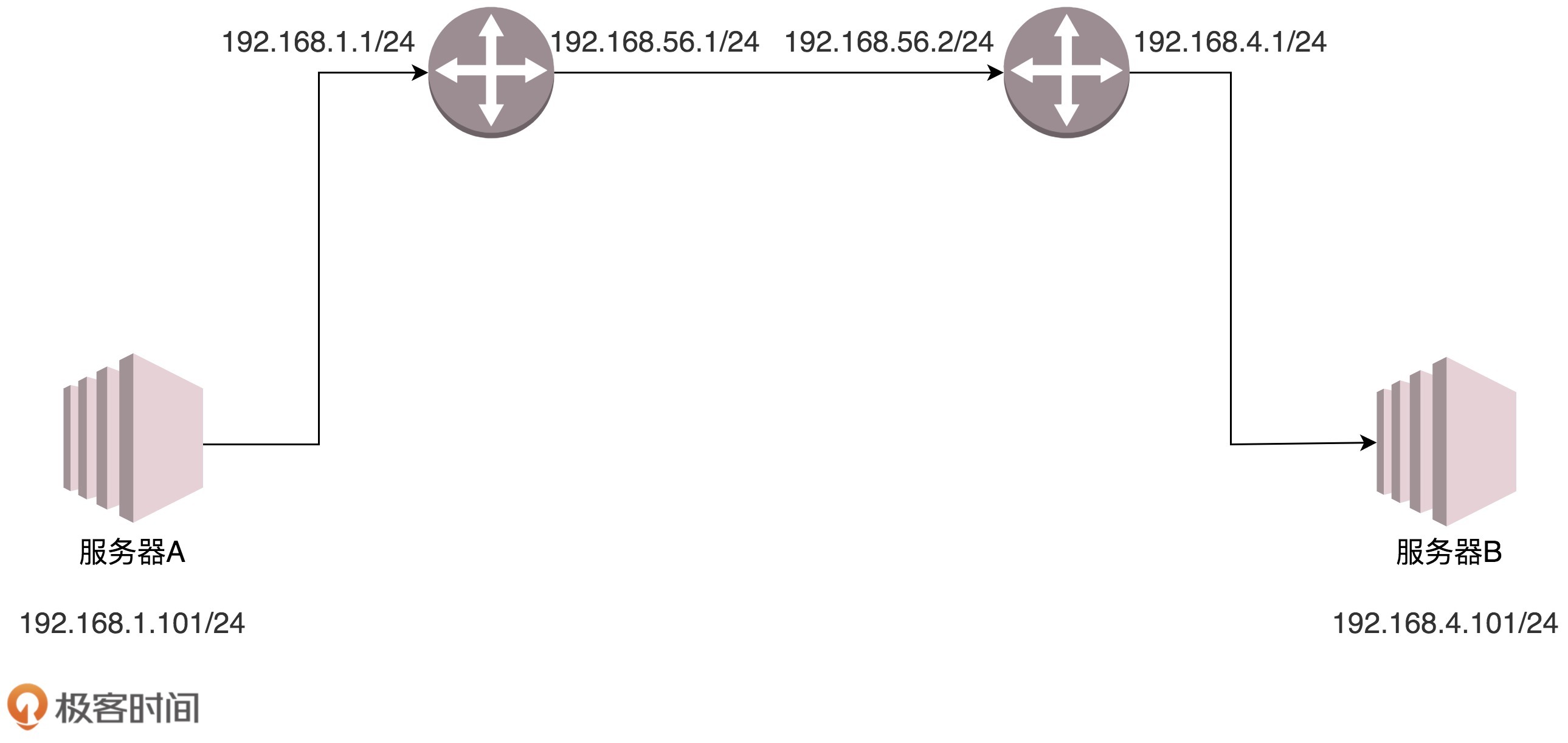 在路由器A中配置了静态路由:要想访问192.168.56.2/24,要从192.168.56.1这个口出去,没有下一跳了,因为我右手这个网卡,就是这个网段的,我是最后一跳了。