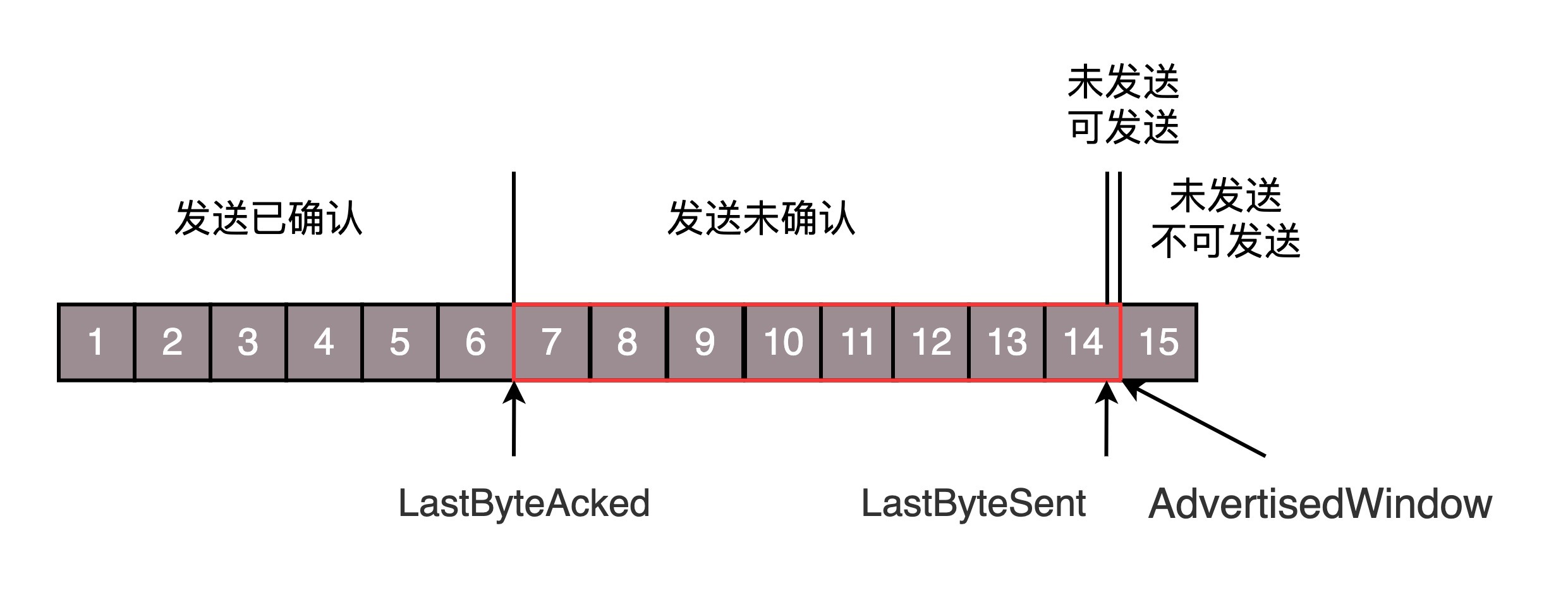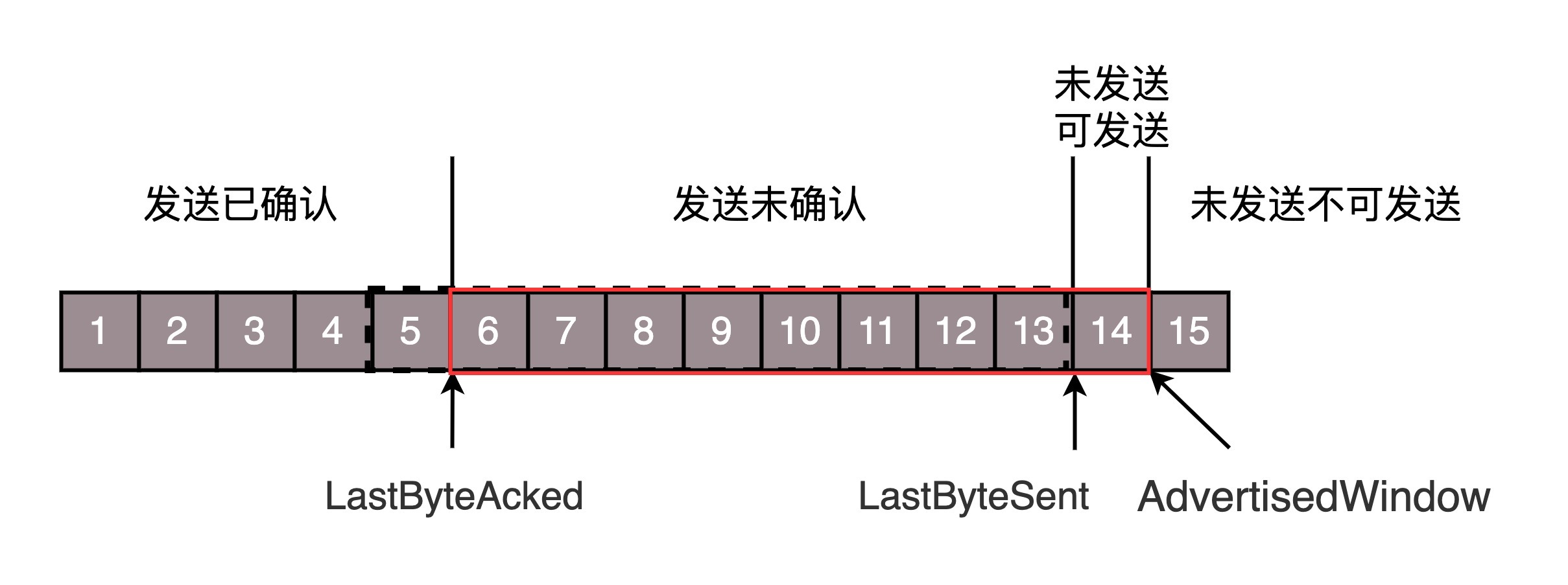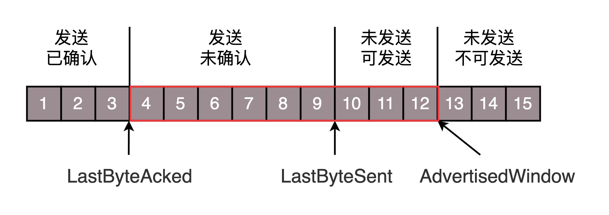 还是刚才的图,在发送端来看,1、2、3已经发送并确认;4、5、6、7、8、9都是发送了还没确认;10、11、12是还没发出的;13、14、15是接收方没有空间,不准备发的。