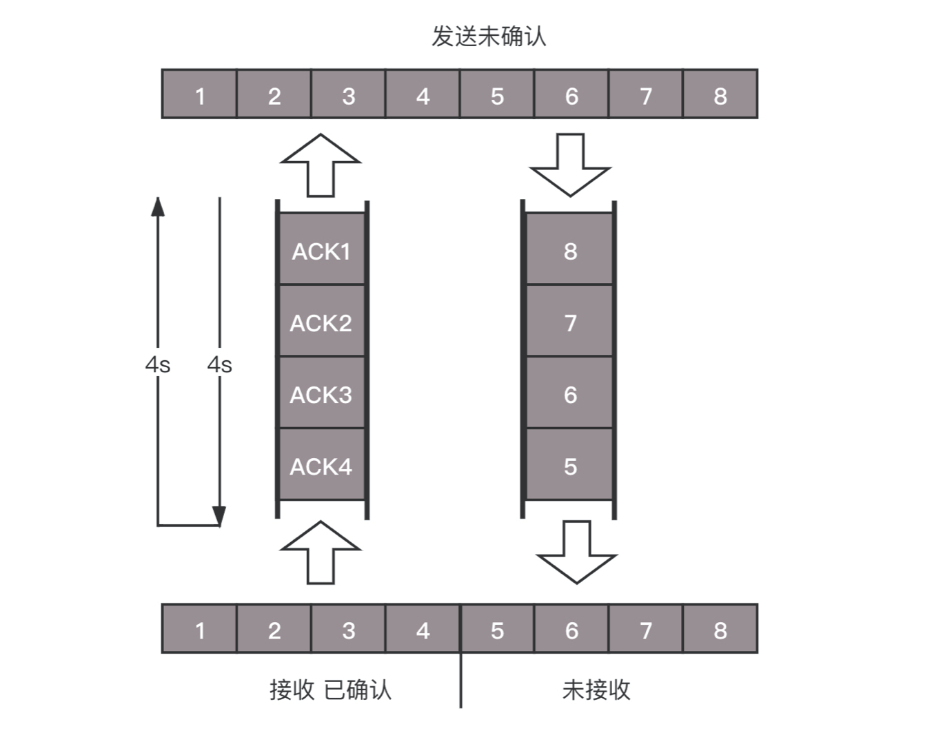 如图所示,假设往返时间为8s,去4s,回4s,每秒发送一个包,每个包1024byte。已经过去了8s,则8个包都发出去了,其中前4个包已经到达接收端,但是ACK还没有返回,不能算发送成功。5-8后四个包还在路上,还没被接收。这个时候,整个管道正好撑满,在发送端,已发送未确认的为8个包,正好等于带宽,也即每秒发送1个包,乘以来回时间8s。