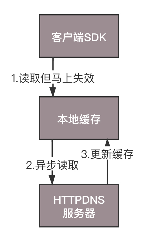HttpDNS的缓存设计策略也是咱们做应用架构中常用的缓存设计模式,也即分为客户端、缓存、数据源三层。