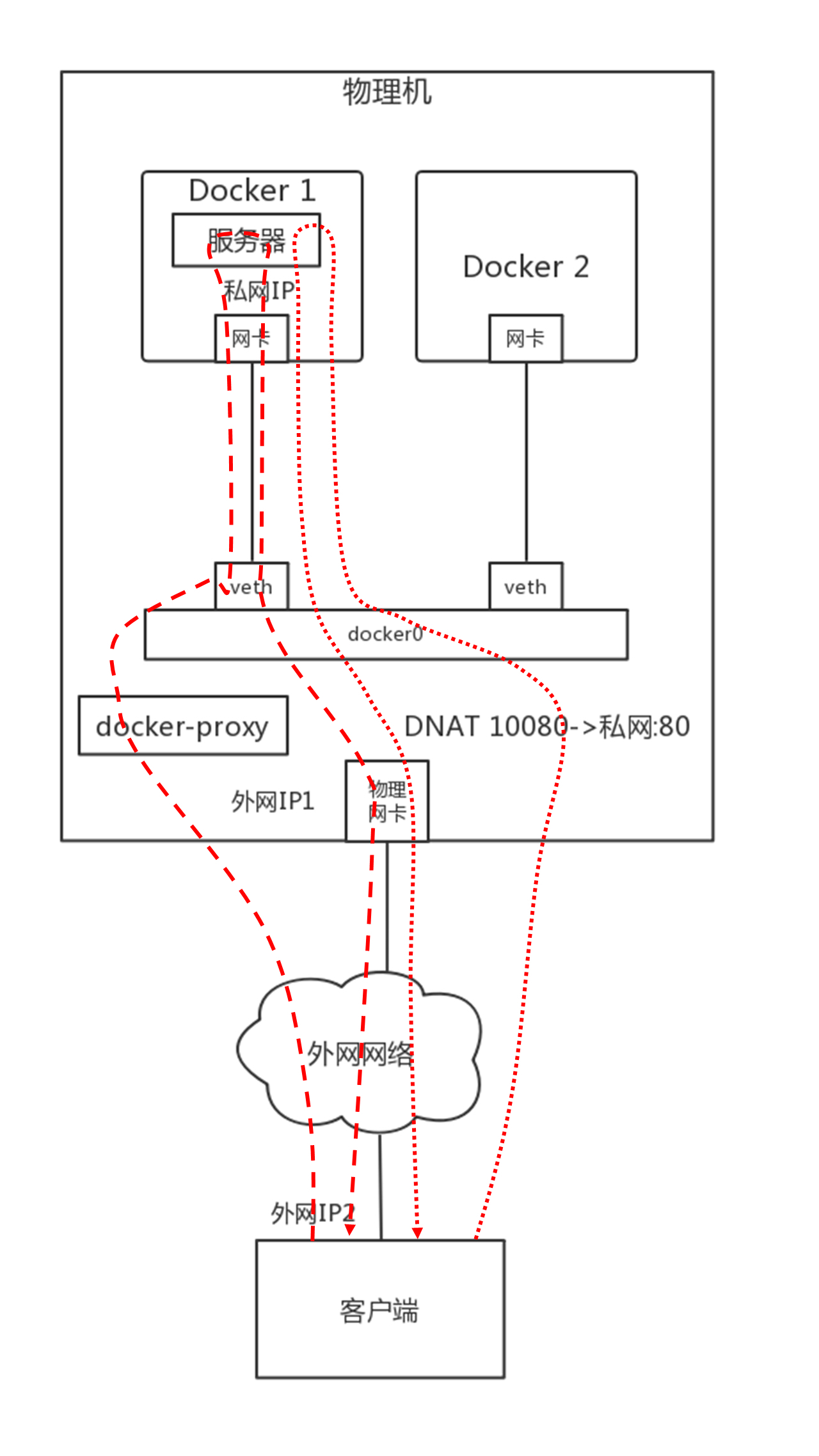 从容器内部的客户端访问外部网络中的服务器,我画了一张图。在[虚拟机]那一节,也有一张类似的图。