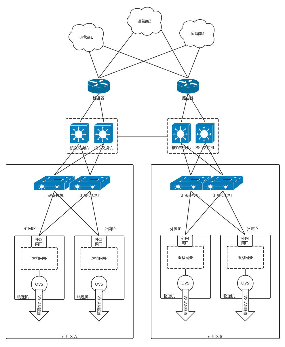 每个可用区都有自己的汇聚交换机,如果机器数目比较多,可以直接用核心交换机,每个Region也有自己的核心交换区域。