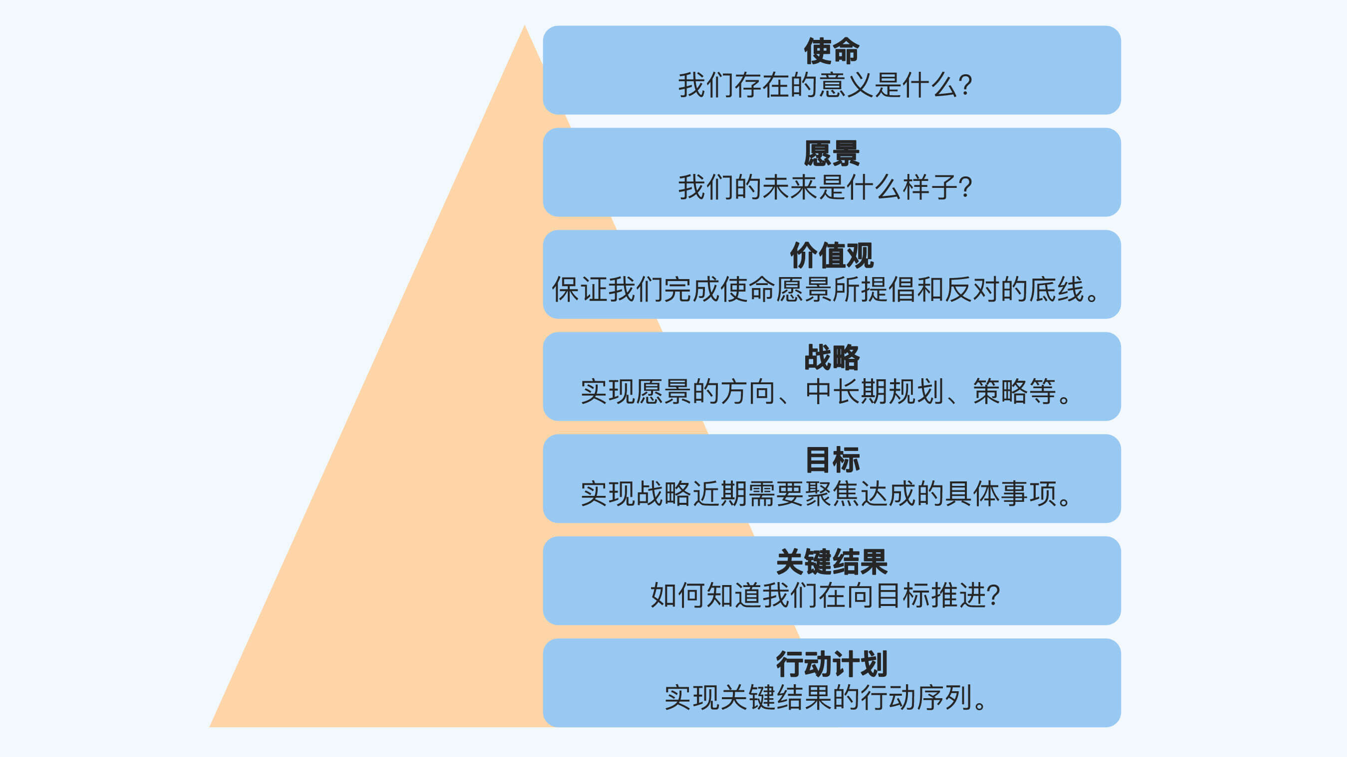 公司的本质是一个商业组织,通过创造价值价值变现来实现生存发展。一个公司如果想要有长久的生命力,就一定要有使命、愿景、价值观、战略、目标、结果和行动计划这样的东西,如下图所示: