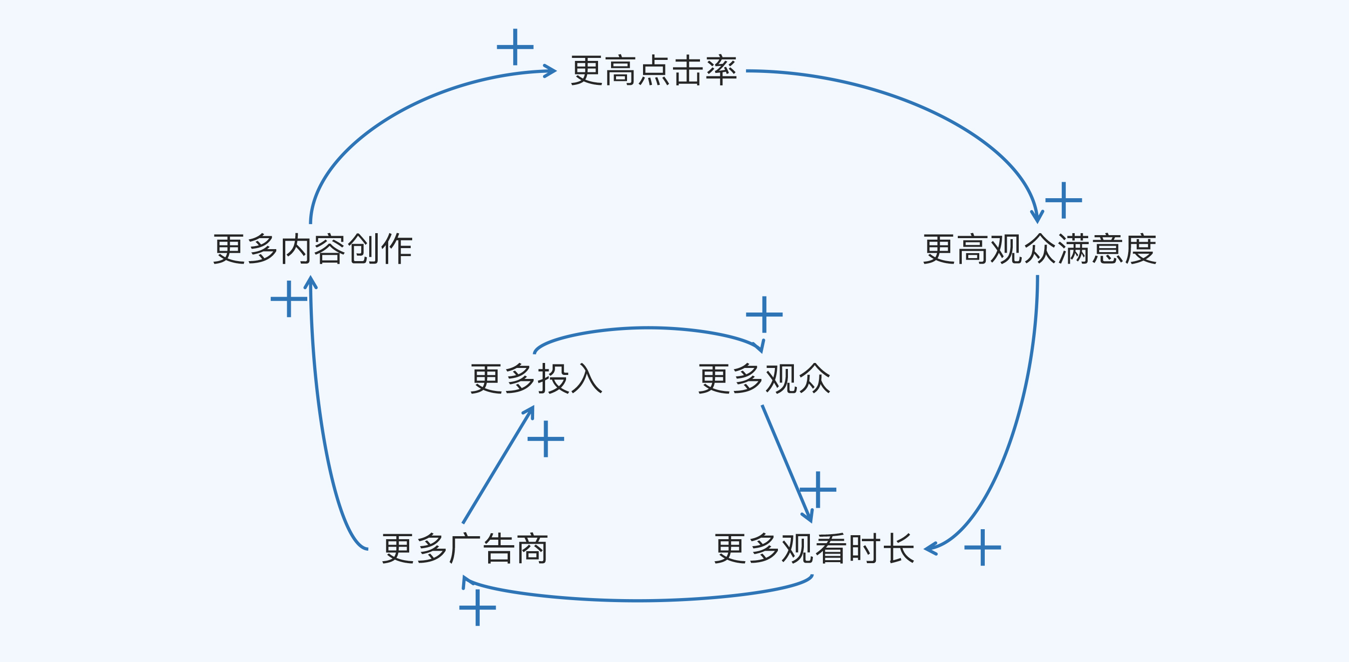 更满意的观看体验带来更长的观看时间,更长的观看时间会吸引更多的广告商,从而激励更多的内容创作者进行创作,于是又会吸引更多的观众。