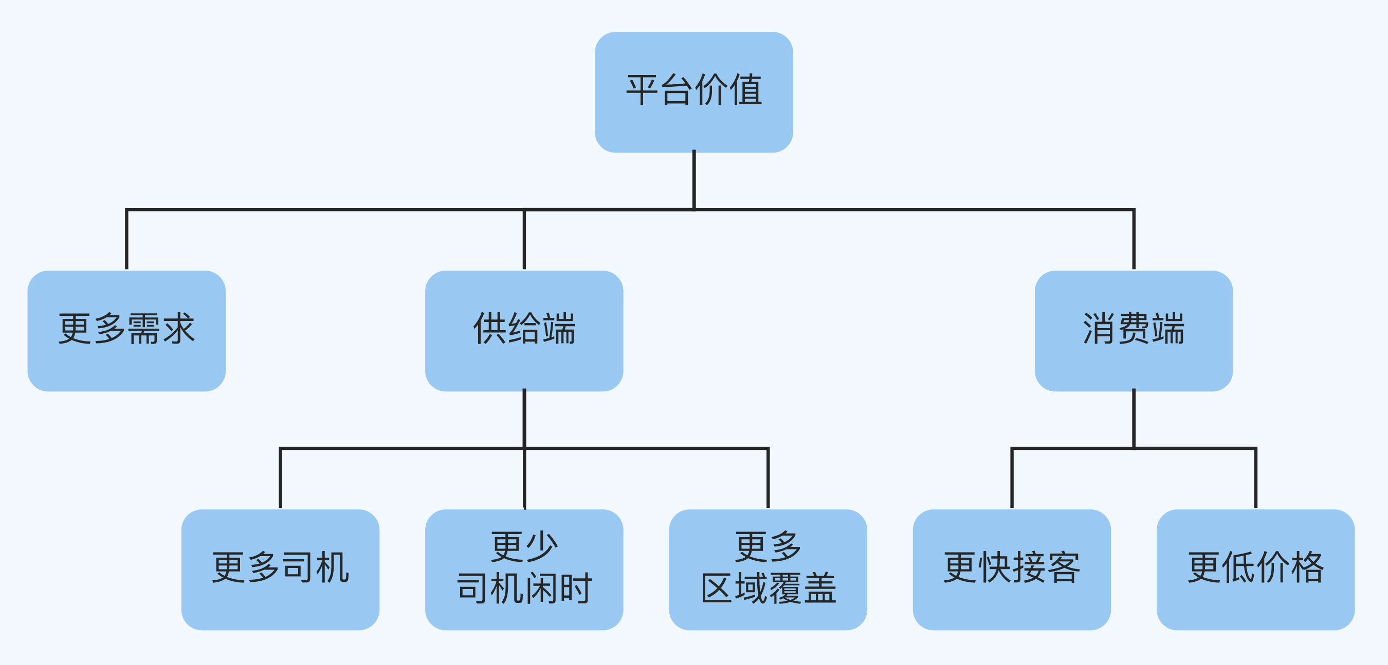 从消费端看,核心是乘客能更快能坐上车车费更便宜,分别代表时间和价格两个维度,于是他们又标记了两个关键节点,更快接客更低价格