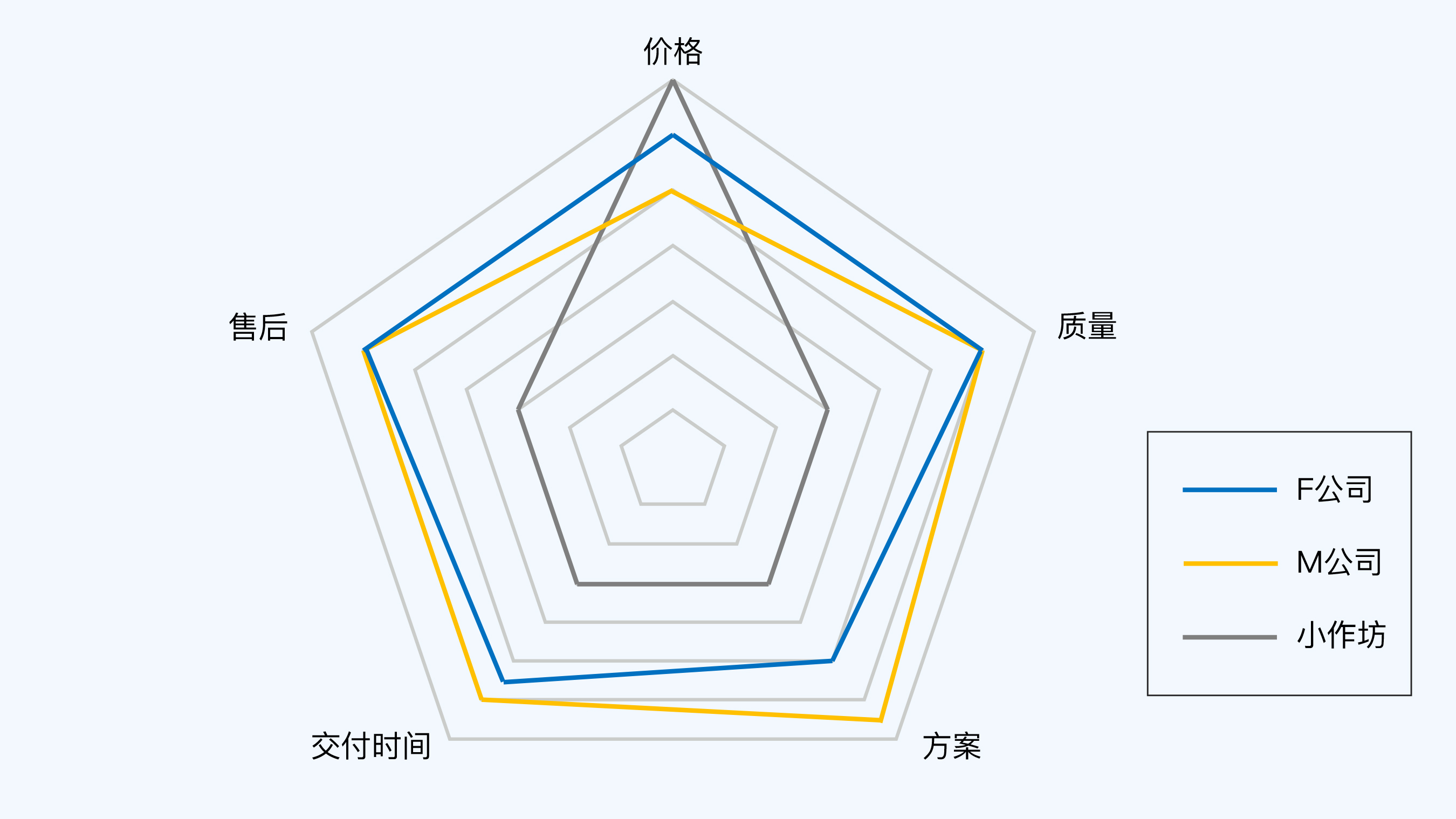 可以看出,F公司如果和M公司对比,质量、交付时间和售后方面的几乎没有区别,价格上甚至更有优势,它们真正的差距在方案上。
