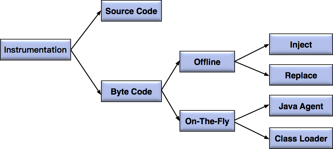 对于Java代码来讲,根据注入目标的不同,可以分为源代码(Source Code)注入和字节码(Byte Code)注入两大类。基于JVM本身特性以及执行效率的原因,目前主流的工具基本都是使用字节码注入,注入的具体实现采用ASM技术。