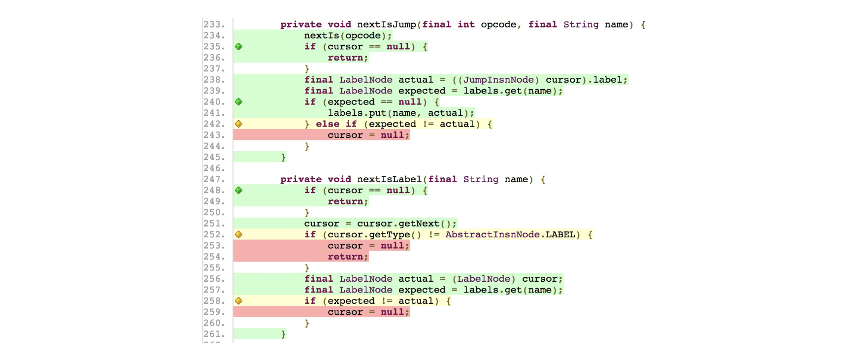 如图2所示为每个Java文件内部详细的代码覆盖率情况,图中绿色的行表示已经被覆盖,红色的行表示尚未被覆盖,黄色的行表示部分覆盖;左侧绿色菱形块表示该分支已经被完全覆盖、黄色菱形块表示该分支仅被部分覆盖。