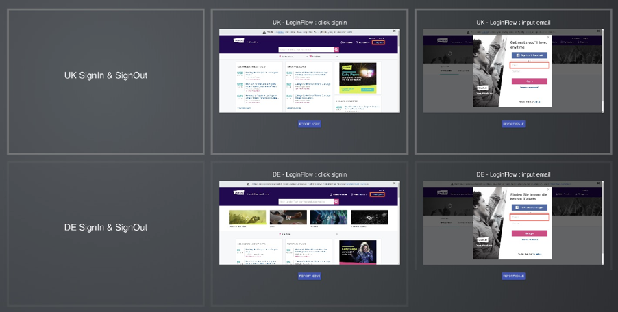 报告的横向,是一个国家的业务测试顺序截图,比如图中第一行是英国网站的登录业务流程顺序截图,第二行是德国网站的登录业务流程顺序截图。报告的纵向,展示的自然就是同一界面在不同国家的形式了。