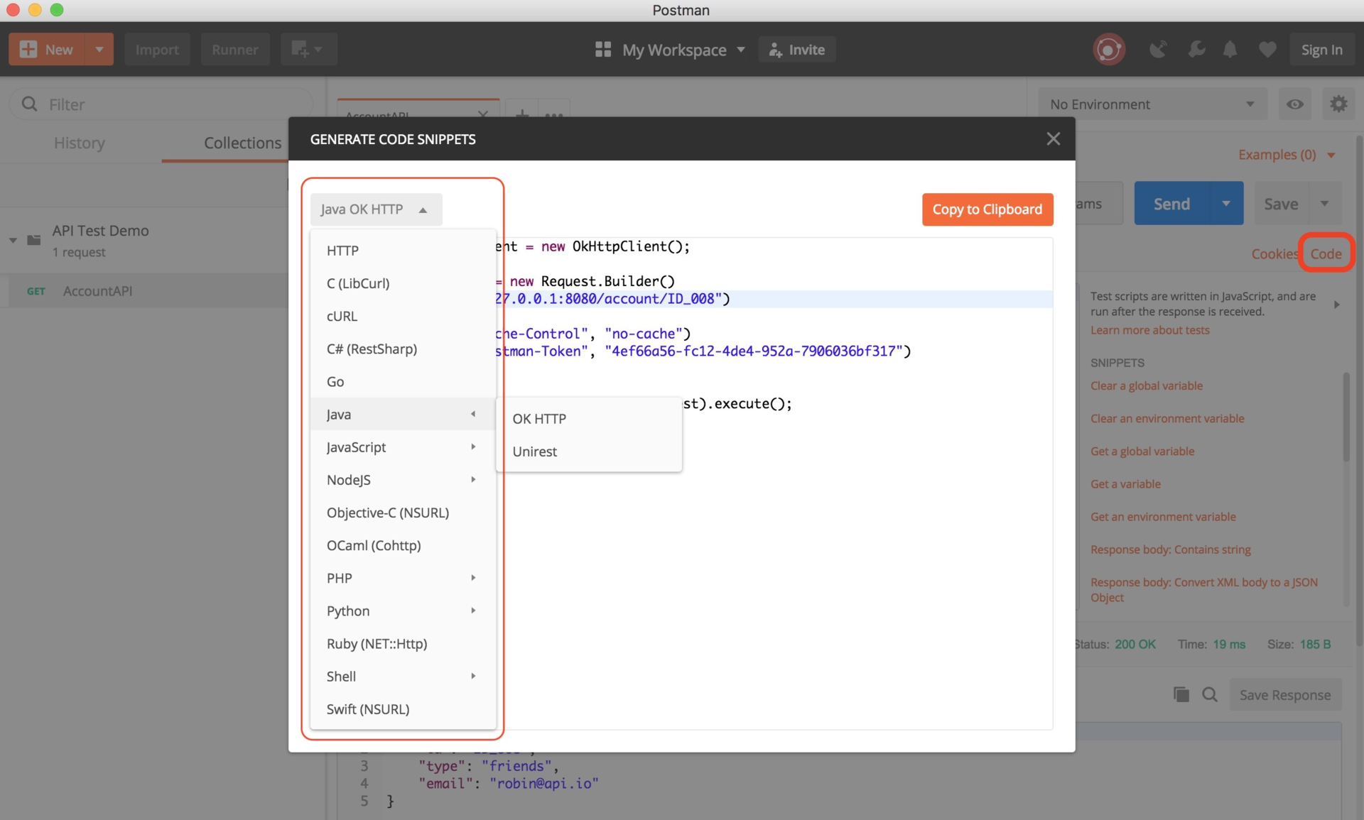 我建立了“API Test Demo”的Collection,并且将刚才的测试request命名为“AccountAPI”保存到这个Collection中。