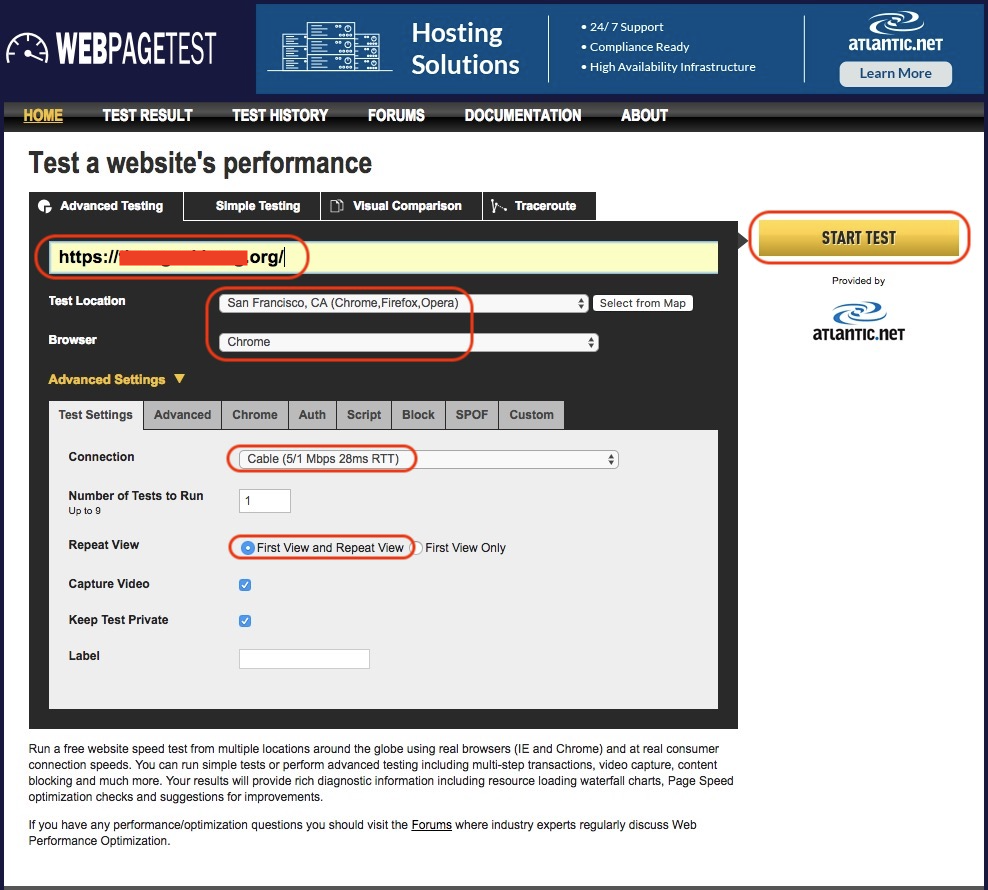 选择测试发起的地域(Test Location)以及你希望使用的浏览器,这里我选择了美国旧金山、Chrome浏览器。