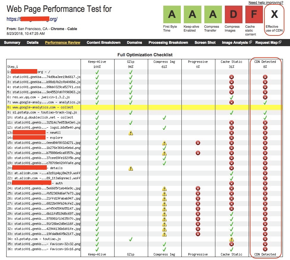 理解了什么是CDN后,我们再一起来看一下本次测试中CDN的使用情况。如图7所示,显然本次被测网站绝大多数的资源并没使用CDN。也许是由于本次发起测试的机器是在美国旧金山,而旧金山可能并不是该网站的目标市场,所以它并没有在这里的CDN上部署资源。