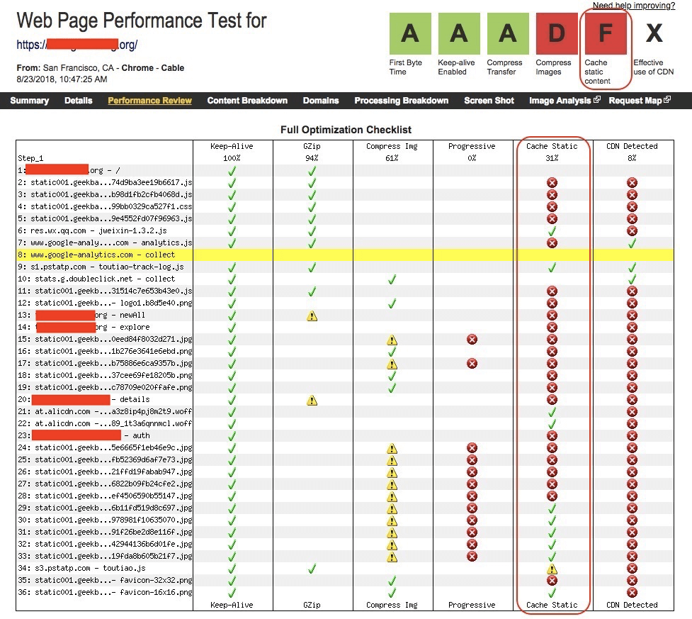 如图6所示,本次测试结果显示,被测网站有超过一半的静态资源没有被浏览器缓存,每次都需要从Web服务器端获取,所以WebPagetest给出了F级的评分。