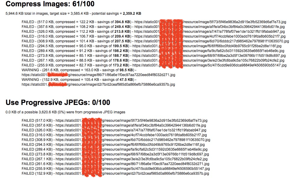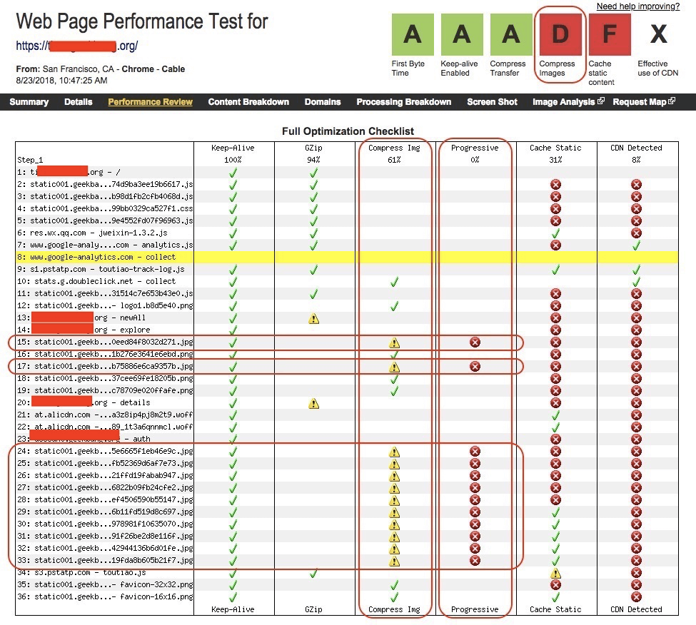 为了减少需要网络传输的数据量,图像文件也需要进行压缩处理。显然本次测试结果显示(图5),所有的JPEG格式图片都没有经过必要的压缩处理,并且所有的JPEG格式图片都没有使用渐进式JPEG(Progressive JPEG)技术,所以WebPagetest给出了D级的评分。