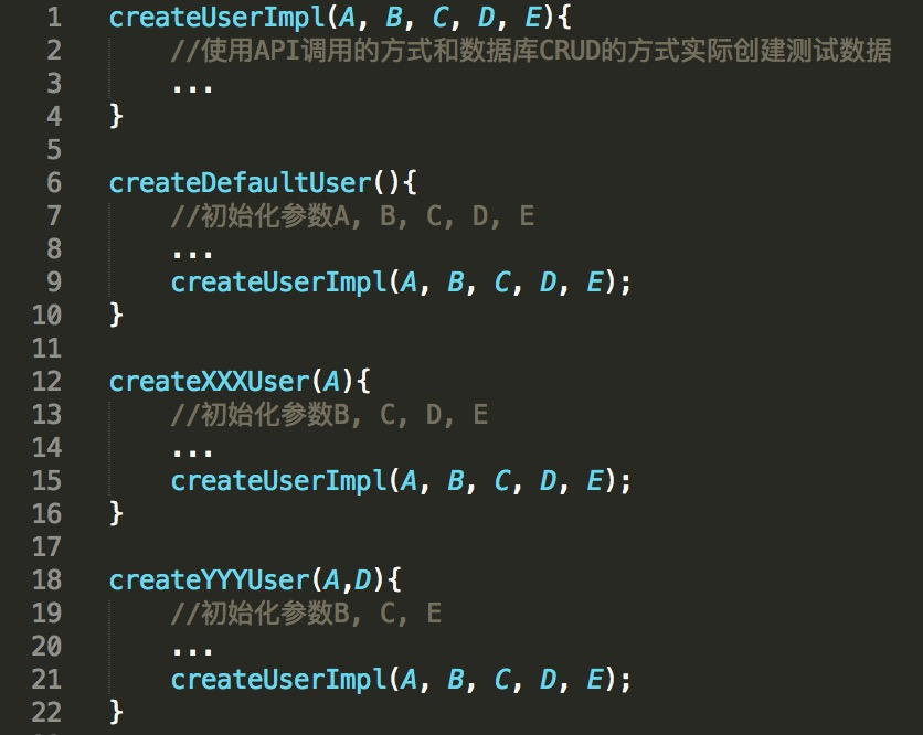 当测试用例需要创建A为特定值的用户时,你就可以直接调用createXXXUser(A)函数,然后createXXXUser(A)函数会用默认的B、C、D、E参数的值加上A的值调用createUserImpl函数,以此完成测试数据的创建工作。