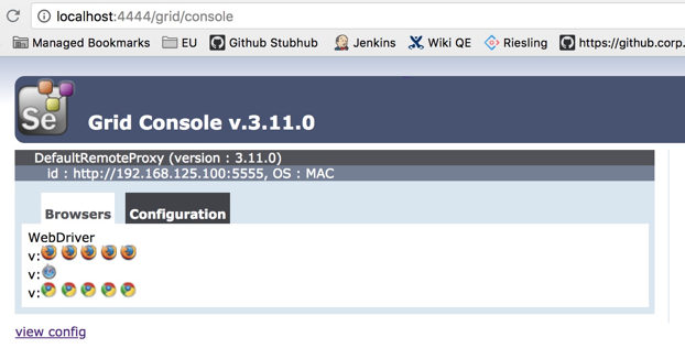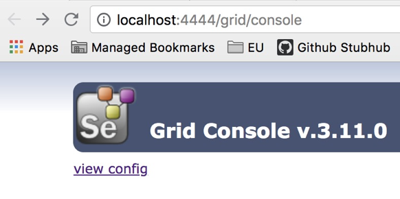 然后,你就可以在这台机器上通过http://localhost:4444/grid/console观察Selenium Hub的状态,也可以在其他机器上通过http://