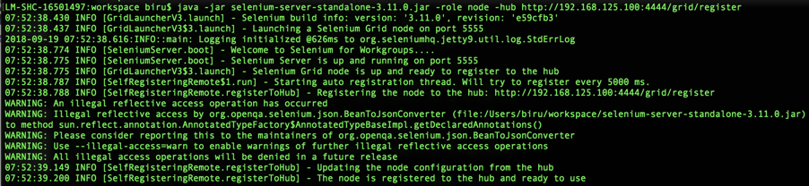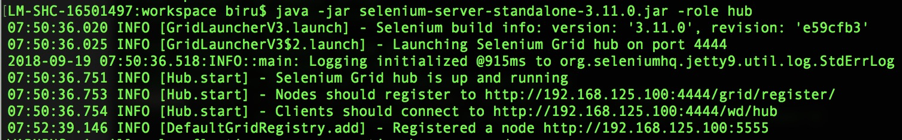 这条命令中,“-role node”的作用是,将该机器启动为Selenium Node,并且通过“-hub”指定了Selenium Hub的节点注册URL。
