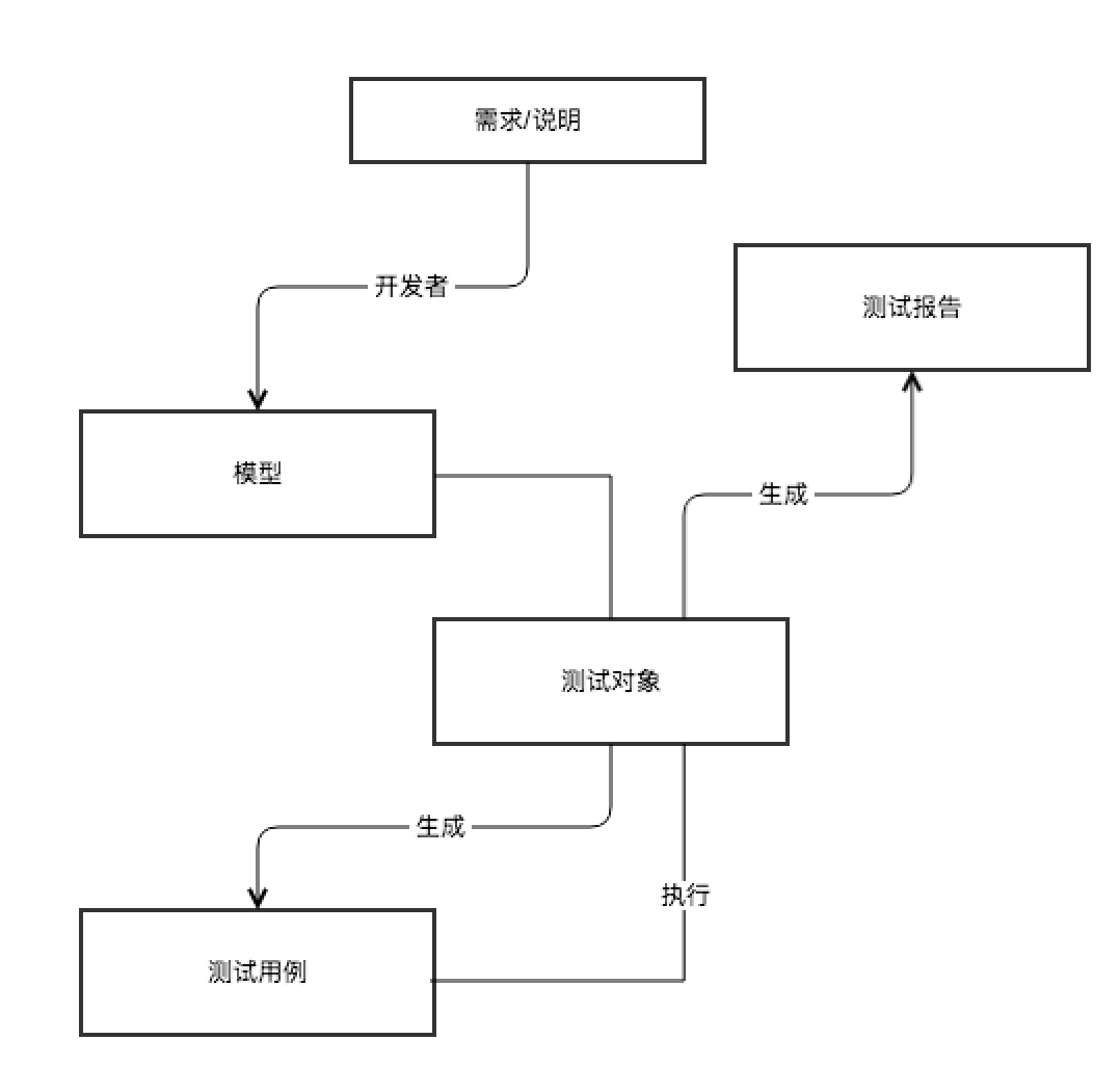 如图1所示,开发者首先根据产品需求或者说明来构建模型,然后结合测试对象生成测试用例,测试用例针对测试对象执行完之后,生成测试报告比对测试结果。