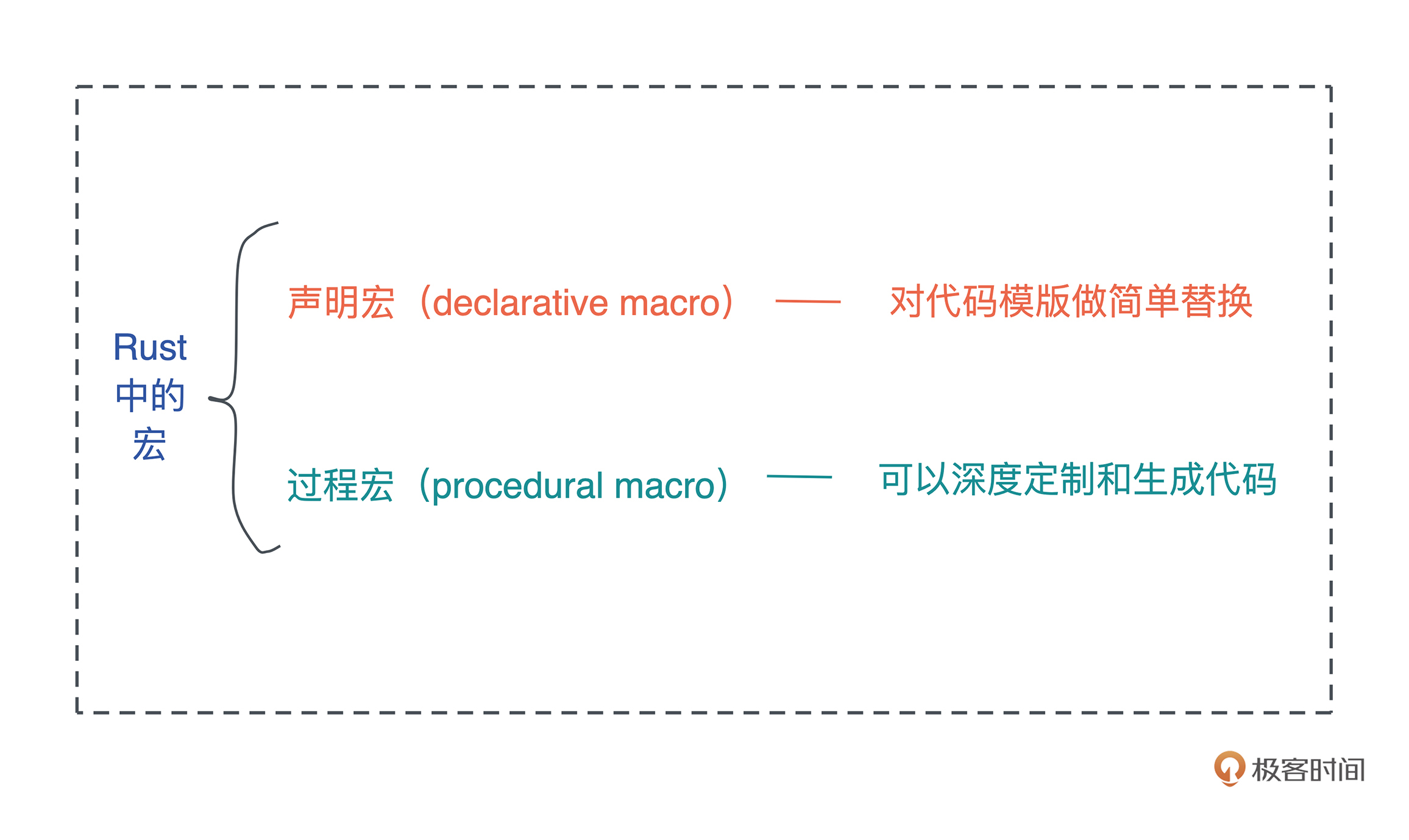其实Rust中的宏就两大类:对代码模板做简单替换的声明宏(declarative macro)、可以深度定制和生成代码的过程宏(procedural macro)。-