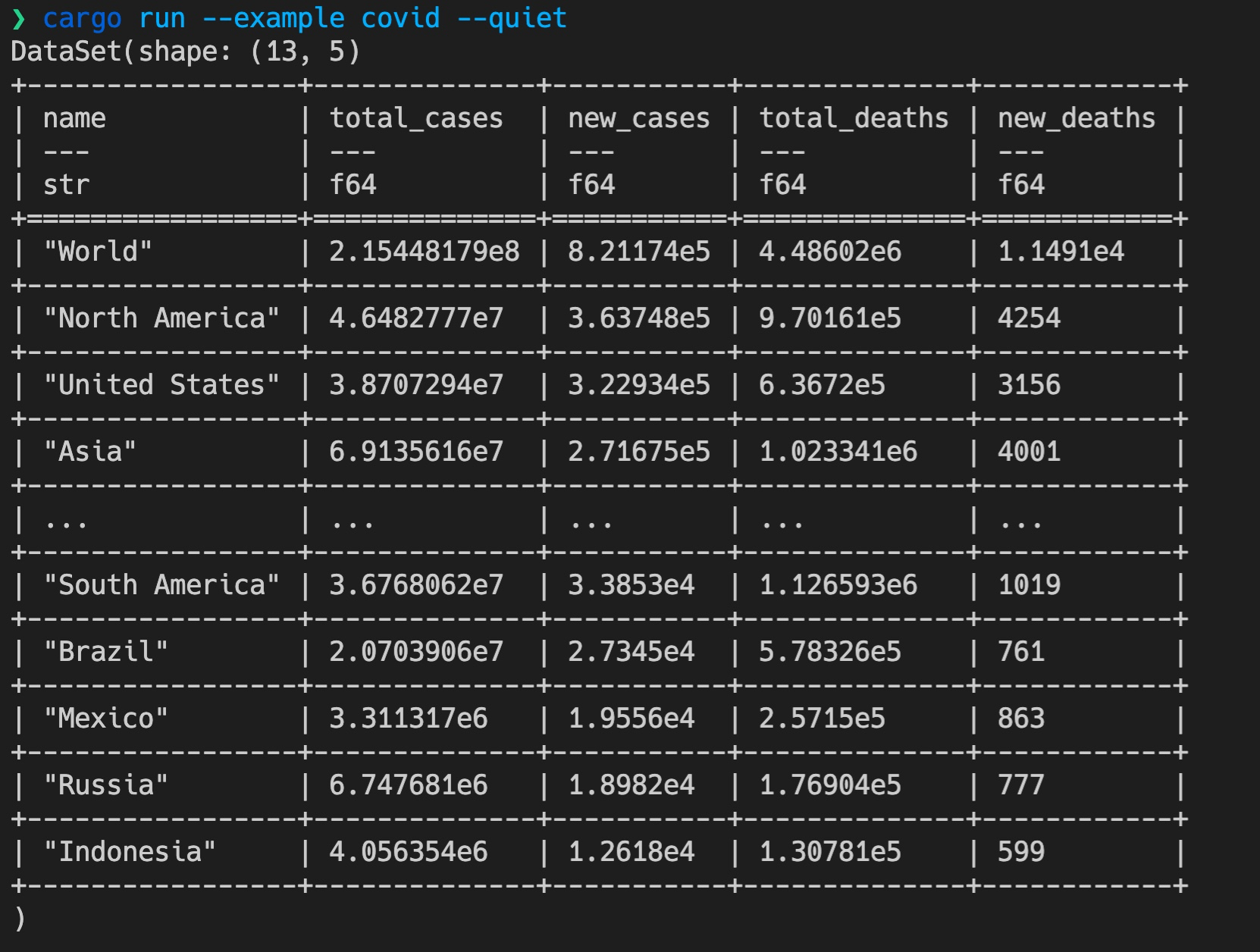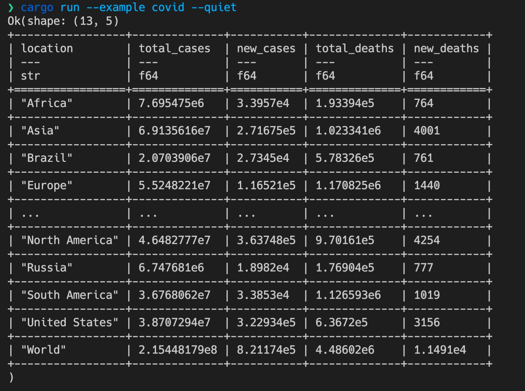 如果代码编译通过了,你可以修改之前的 examples/covid.rs,使用 SQL 来查询测试一下: