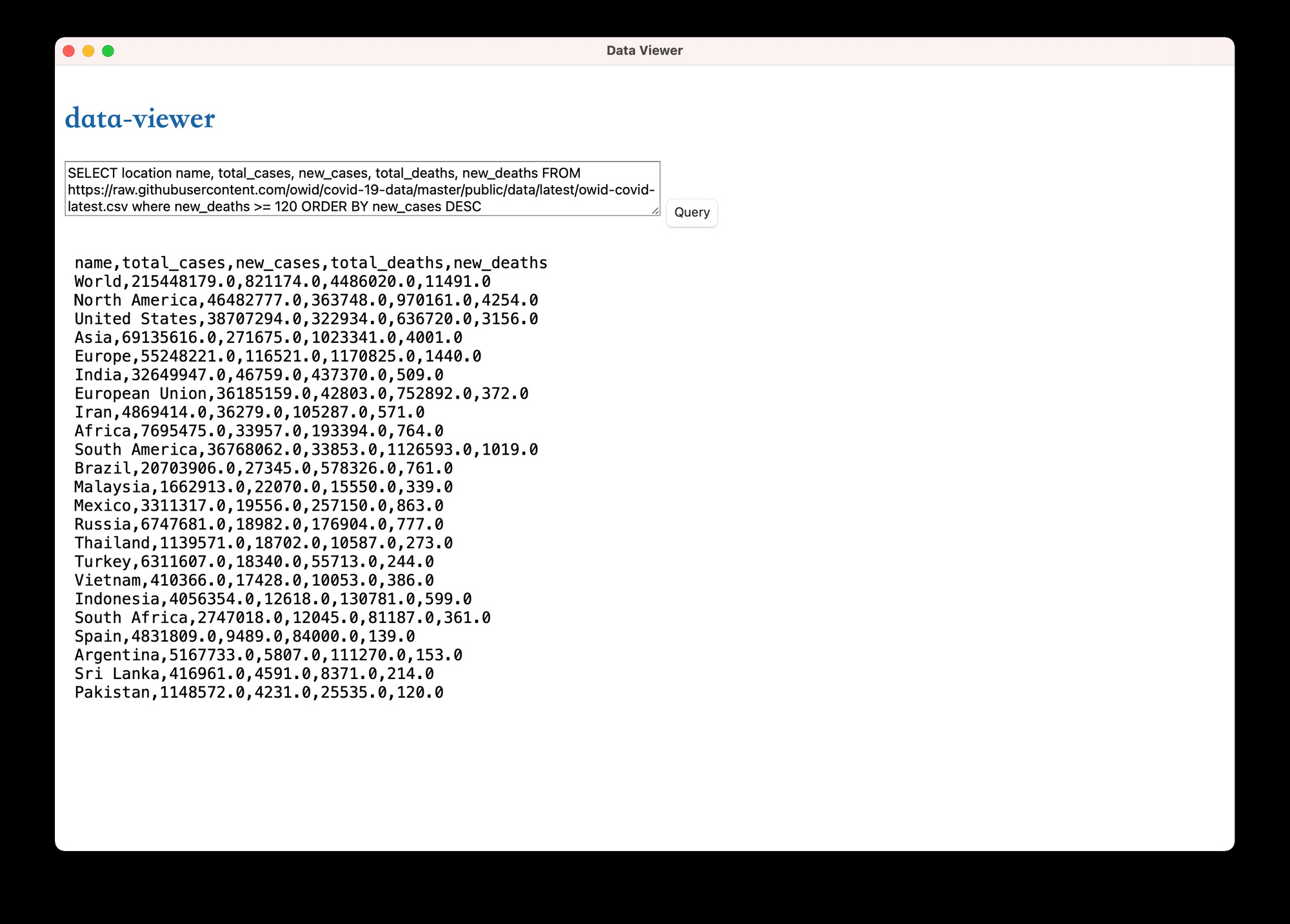 我写了一个简单的 tuari App 叫 data-viewer,如果你感兴趣的话,可以在 github repo 下的 data-viewer 目录下看 tauri 使用 queryer 的代码,下面是运行后的效果。为了让代码最简单,前端没有用任何框架,如果你是一名前端开发者,可以用 Vue 或者 React 加上一个合适的 CSS 库让整个界面变得更加友好。-