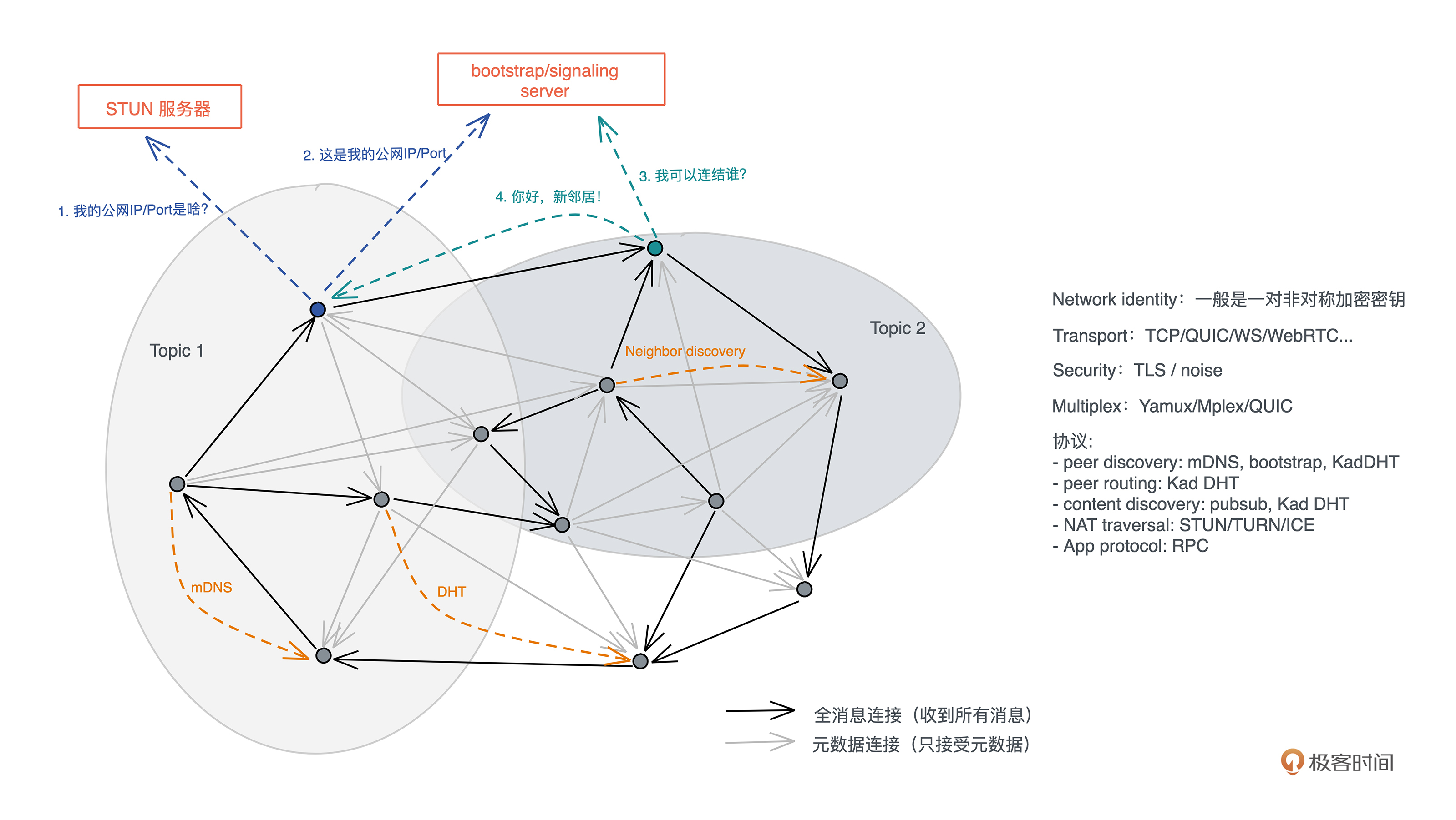 在一个大型的 P2P 网络中,一个节点常常会拥有几十个邻居,通过这些邻居以及邻居掌握的网络信息,每个节点都能构建一张如何找到某个节点(某个数据)的路由表。在此之上,节点还可以加入某个或者某些 topic,然后通过某些协议(比如 gossip)在整个 topic 下扩散消息:-
