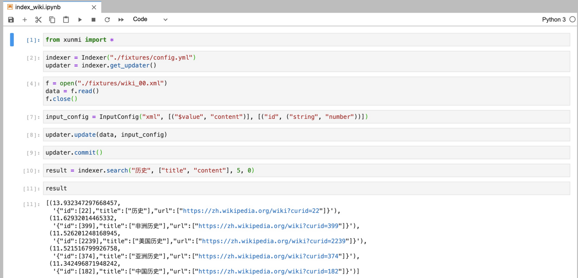 你可以去这门课的 GitHub repo 里,下载可以用于测试的 fixtures,以及 Jupyter Notebook(index_wiki.ipynb)。