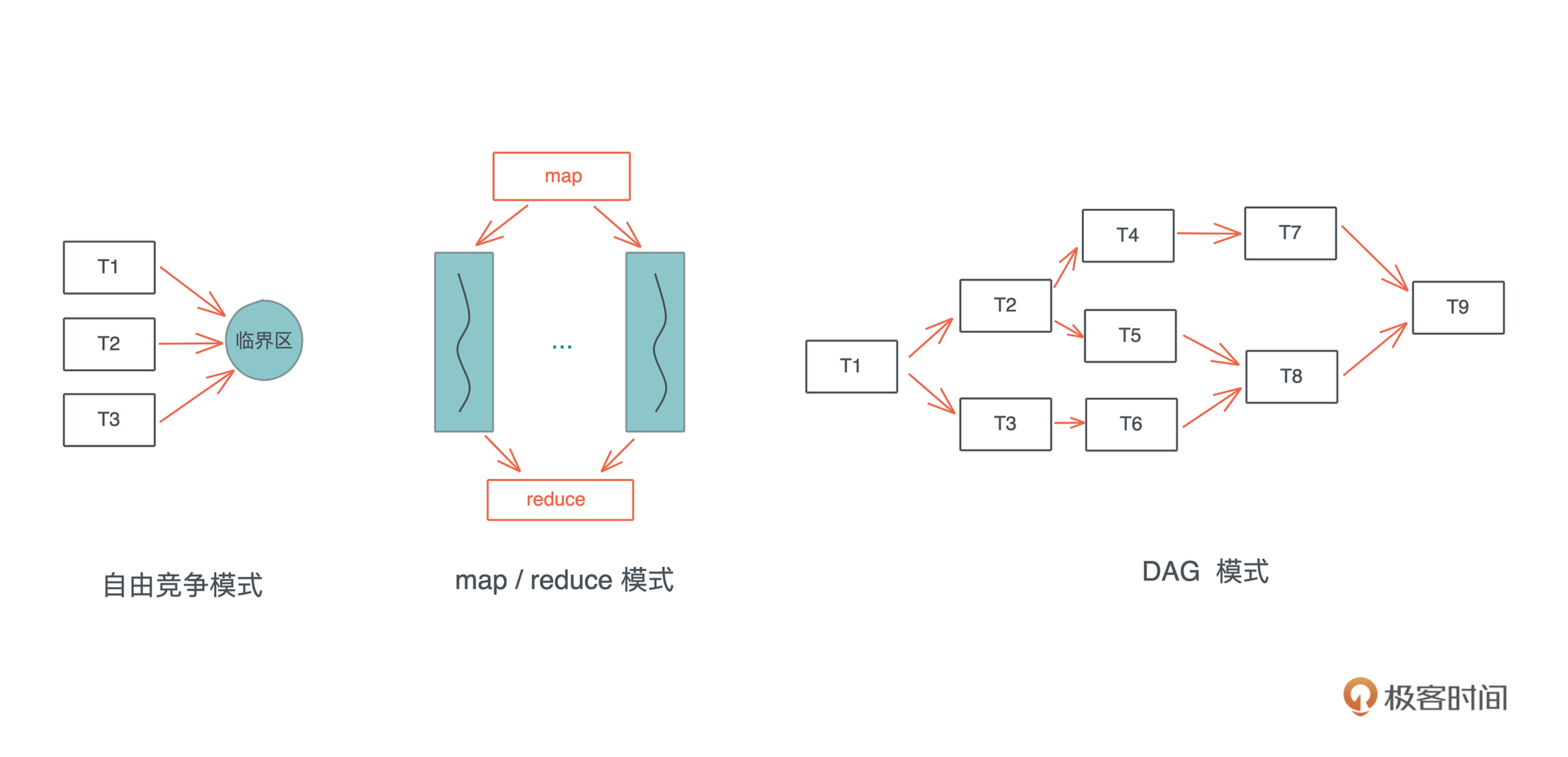 对于并发状态下这三种常见的工作模式:自由竞争模式、map/reduce 模式、DAG 模式,我们的难点是如何在这些并发的任务中进行同步。atomic/Mutex 解决了自由竞争模式下并发任务的同步问题,也能够很好地解决 map/reduce 模式下的同步问题,因为此时同步只发生在 map 和 reduce 两个阶段。-