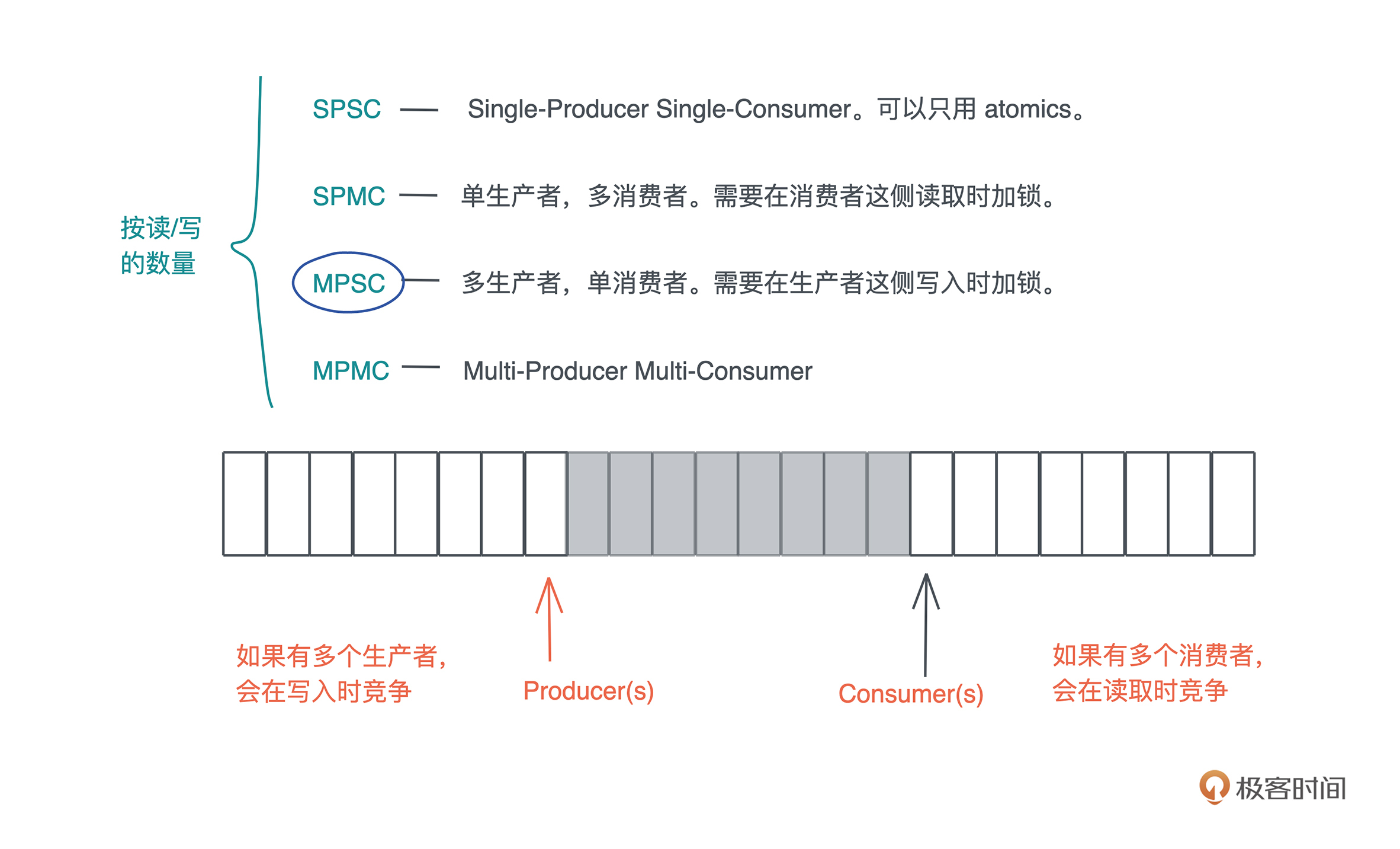 notify_one 通知写者,唤醒某个写者使其能够继续写入。因此,实现中,一般会用到 Mutex + Condvar + VecDeque 来实现;如果不用 Condvar,可以直接使用 thread::park + thread::notify 来完成(flume 的做法);如果不用 VecDeque,也可以使用双向链表或者其它的 ring buffer 的实现。