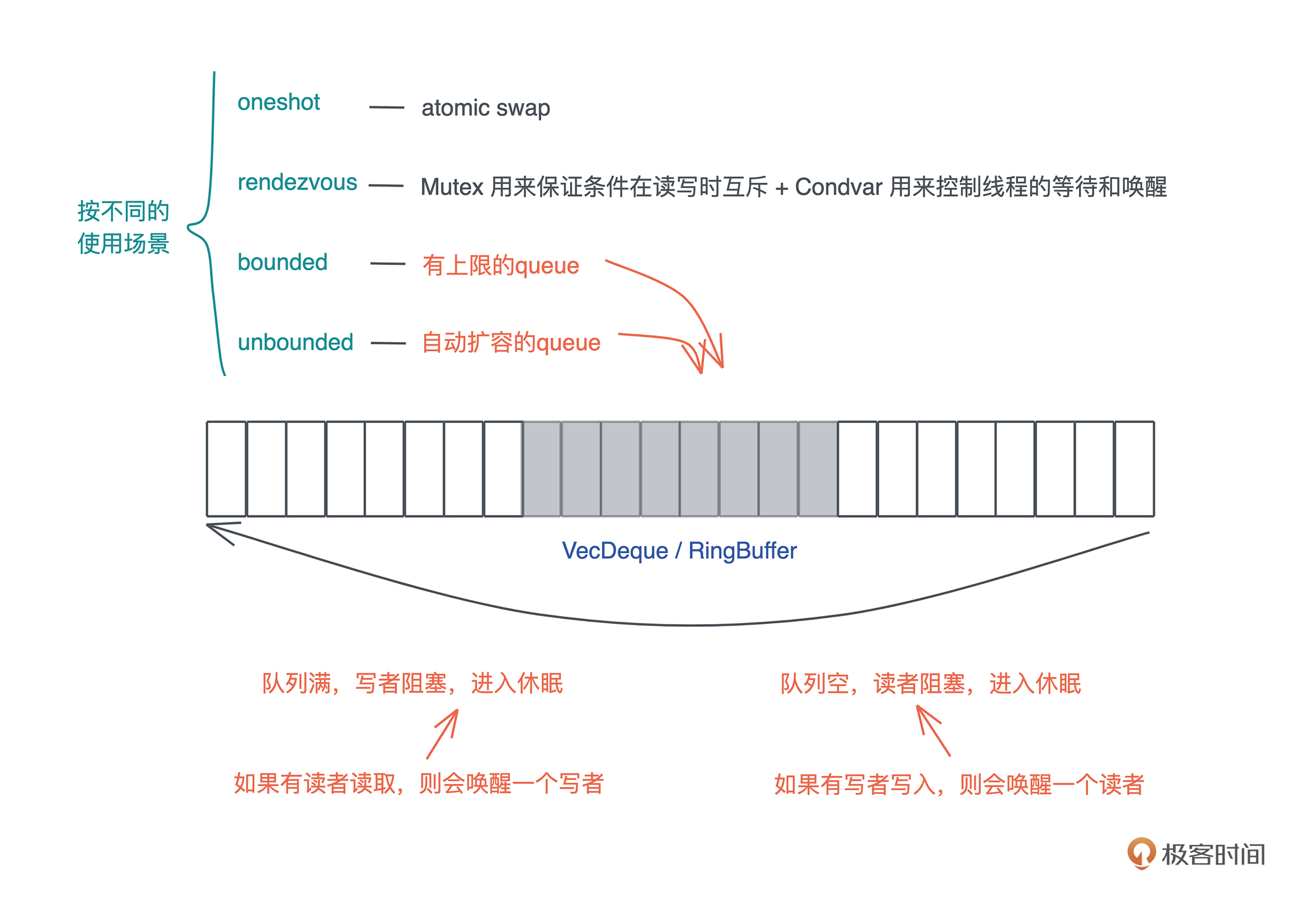 Vec 、VecDeque 都是自动扩容的。unbounded 和 bounded 相比,除了不阻塞写者,其它实现都很类似。所有这些 channel 类型,同步和异步的实现思路大同小异,主要的区别在于挂起/唤醒的对象。在同步的世界里,挂起/唤醒的对象是线程;而异步的世界里,是粒度很小的 task。-