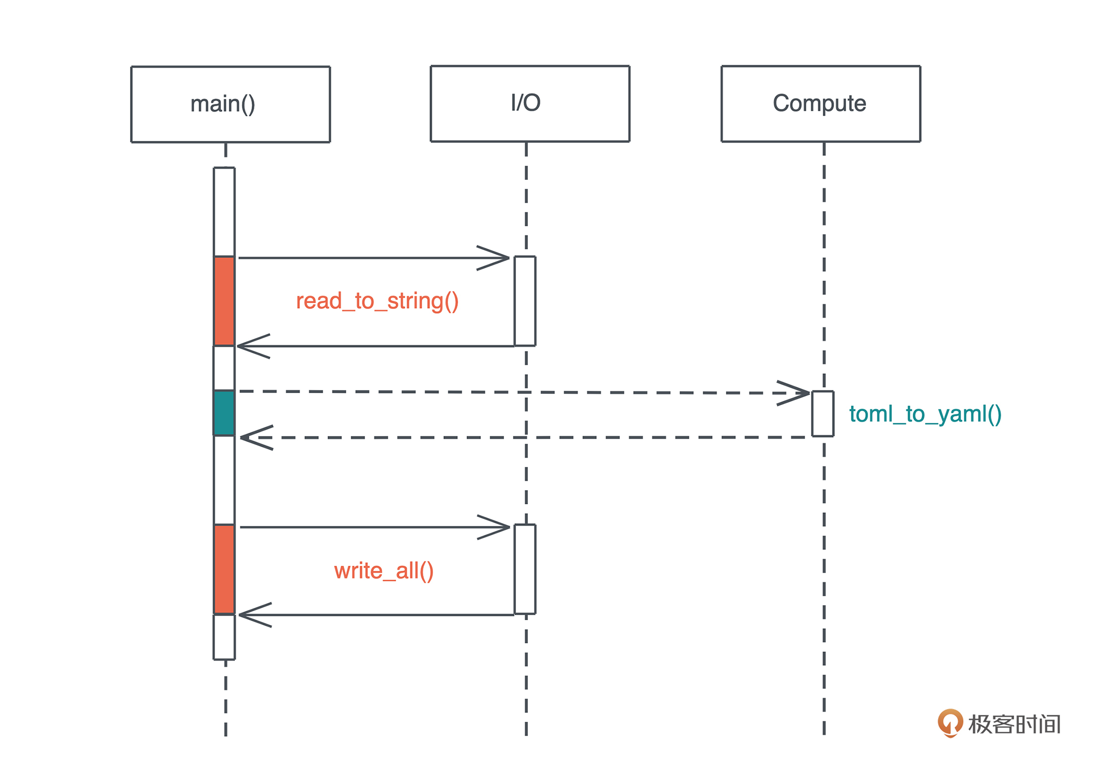 虽然说这段代码的逻辑并没有问题,但性能有很大的问题。在读 Cargo.toml 时,整个主线程被阻塞,直到 Cargo.toml 读完,才能继续读下一个待处理的文件。整个主线程,只有在运行 toml2yaml 的时间片内,才真正在执行计算任务,之前的读取文件以及之后的写入文件,CPU 都在闲置。-