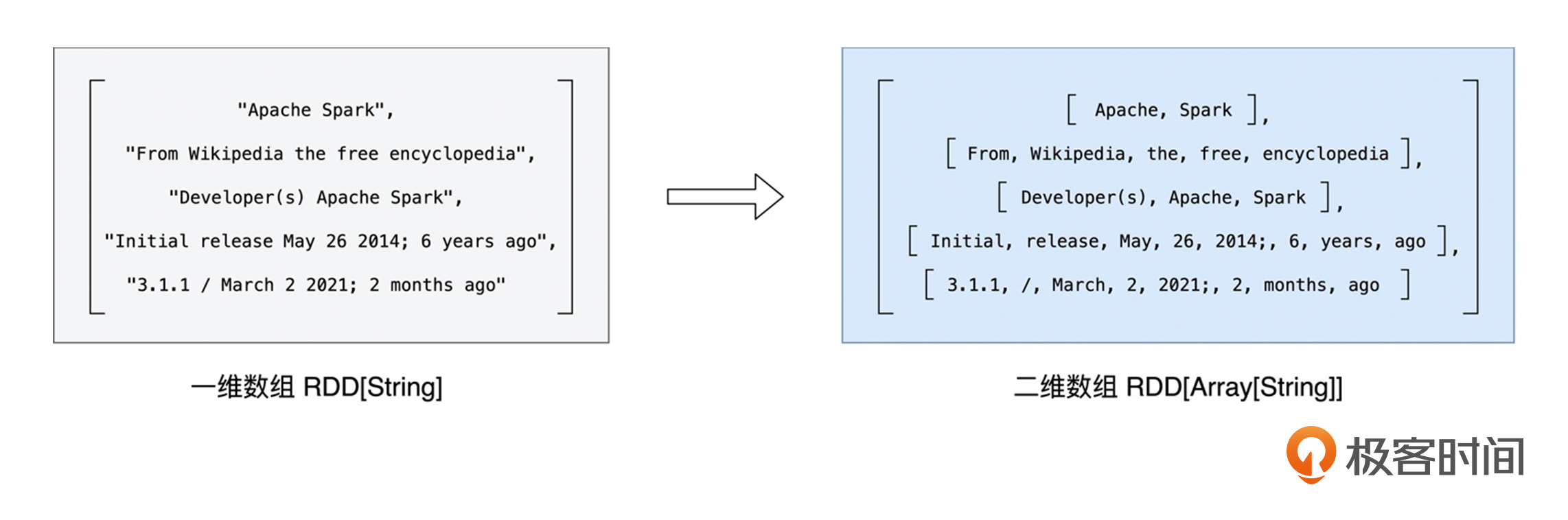 在这里,你不妨先简单地把RDD理解成“数组”,比如代码中的lineRDD变量,它的类型是RDD[String],你可以暂时把它当成元素类型是String的数组,数组的每个元素都是文件中的一行字符串。