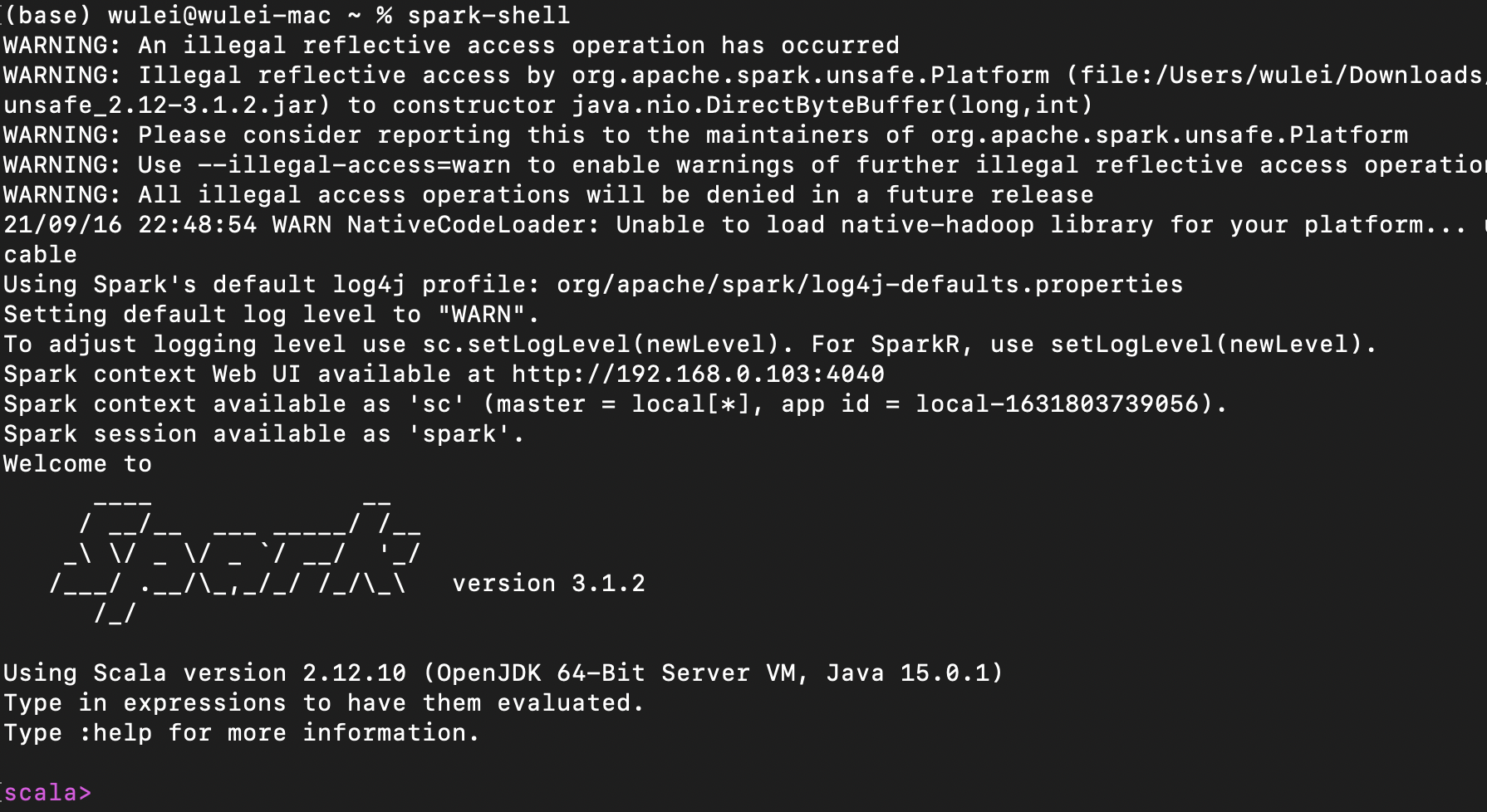 应用开发完成之后,我们就可以把代码丢进已经准备好的本地Spark部署环境里啦。首先,我们打开命令行终端(Terminal),敲入“spark-shell”,打开交互式运行环境,如下图所示。