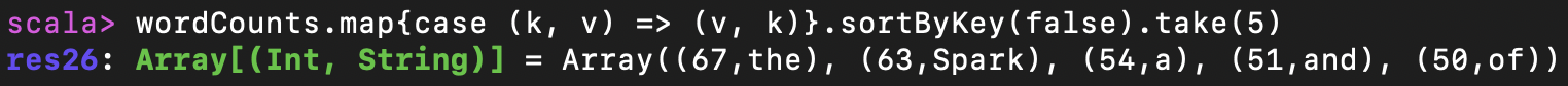 wordCounts.map{case (k, v) => (v, k)}.sortByKey(false).take(5)