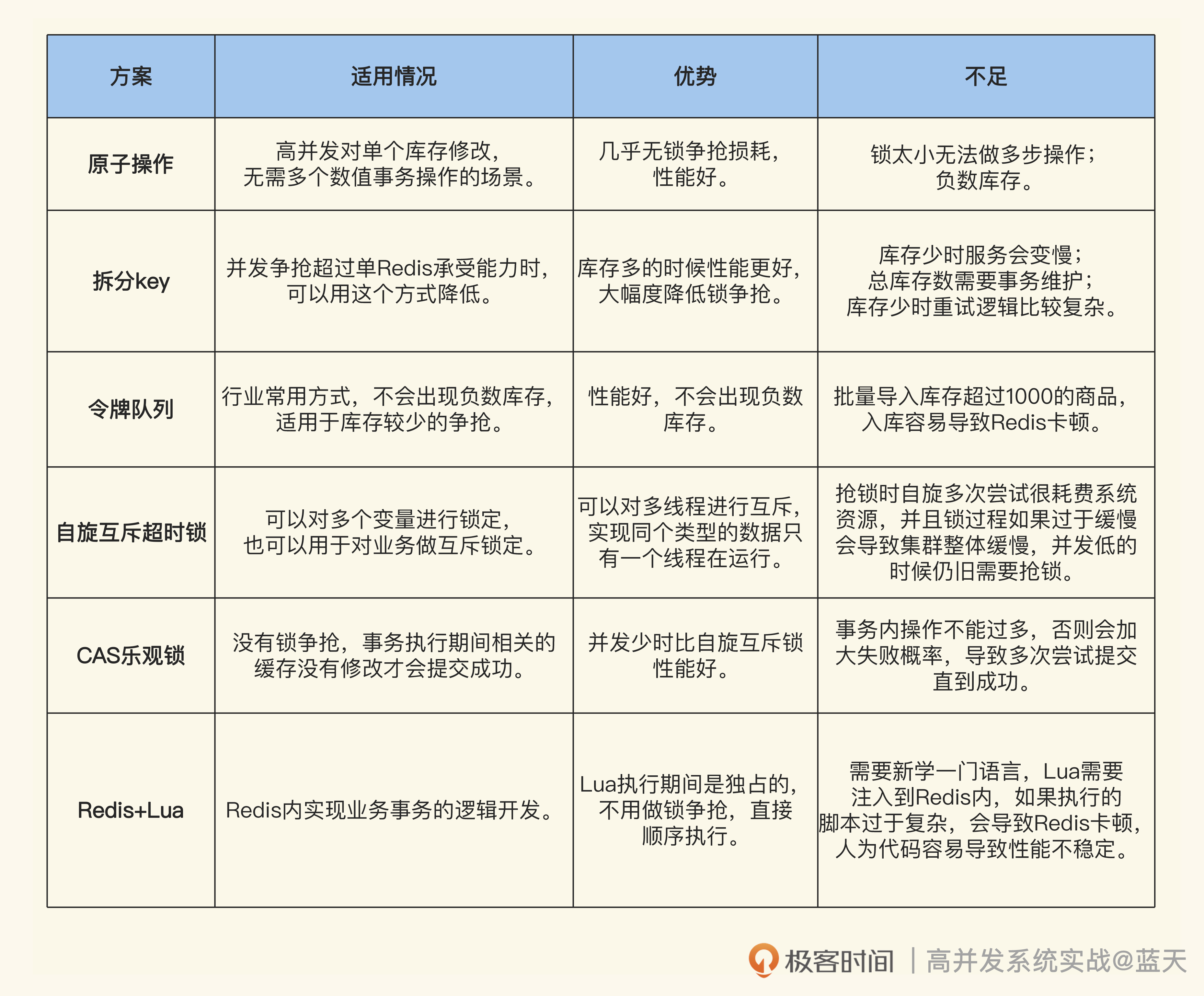 这节课,我们针对库存锁争抢的问题,通过Redis的特性实现了六种方案,不过它们各有优缺点。