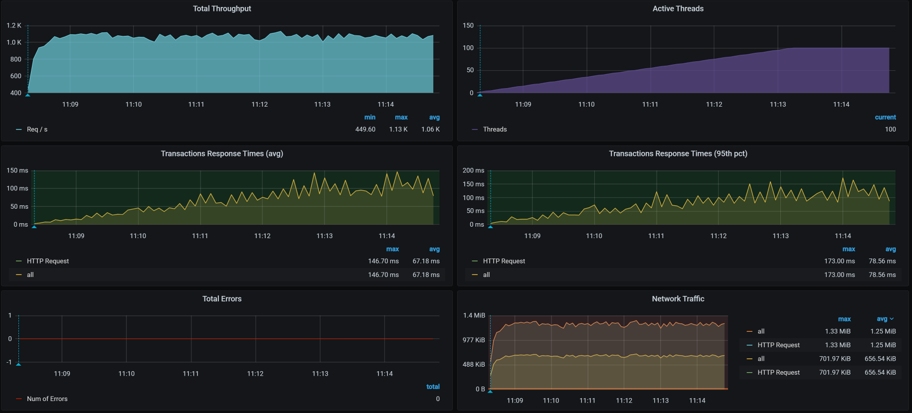 那我们就修改Tomcat参数,把线程数、连接数调大,再来一次。你可能奇怪,为什么要这样调呢?这是因为在查看应用线程健康状态的过程中,我注意到Spring Boot里的Tomcat线程很忙。