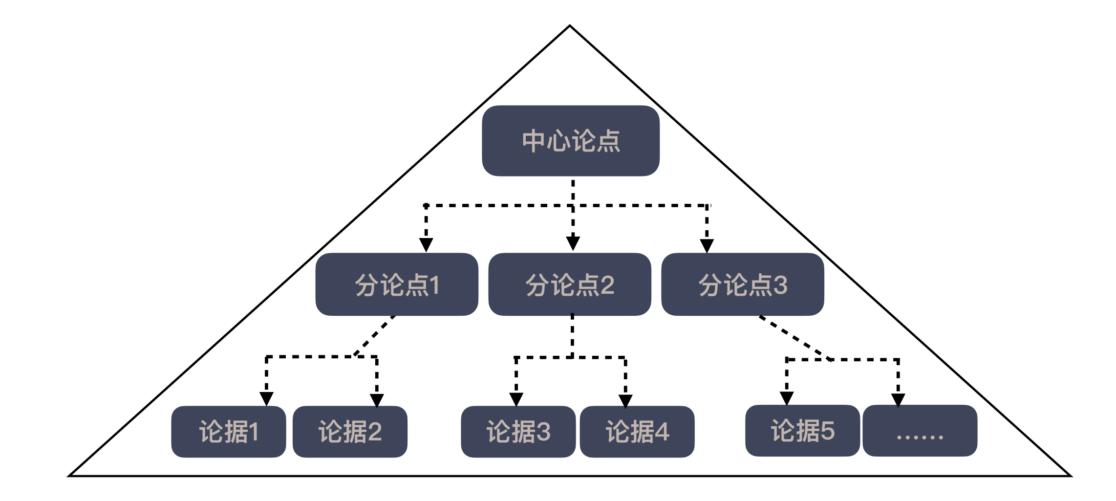 从中心论点、分论点至论据,这样一层层向下展开,从结构上看,就像金字塔一样,所以,这个方法称之为金字塔原理。