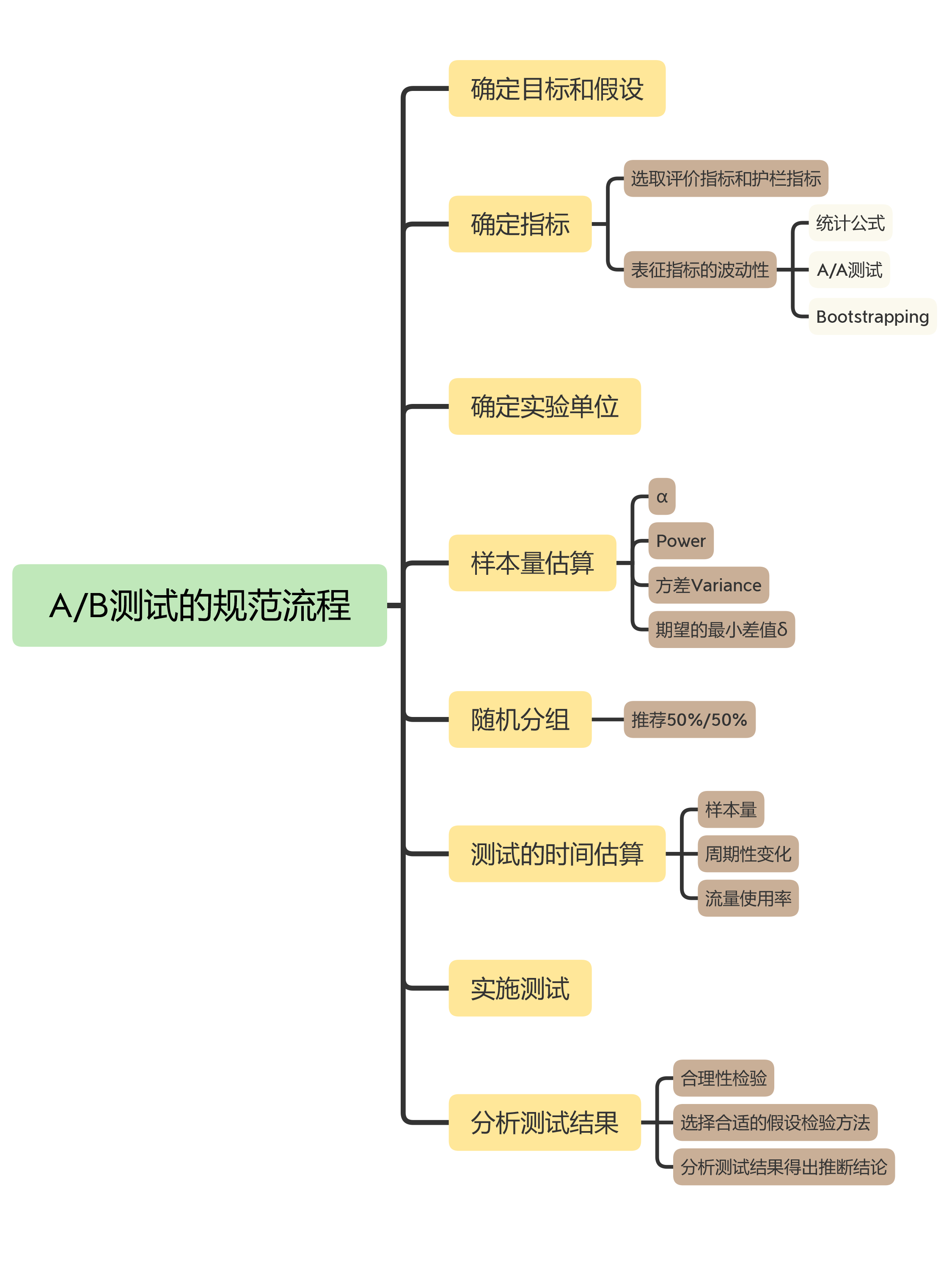 以上就是一个规范的做A/B测试的流程了。你看啊,A/B测试的实践性很强,但大体就是这么几步。在这门课里,我会着重讲最核心的5个部分,也就是确定目标和假设、确定指标、确定实验单位、估算样本量以及分析测试结果。