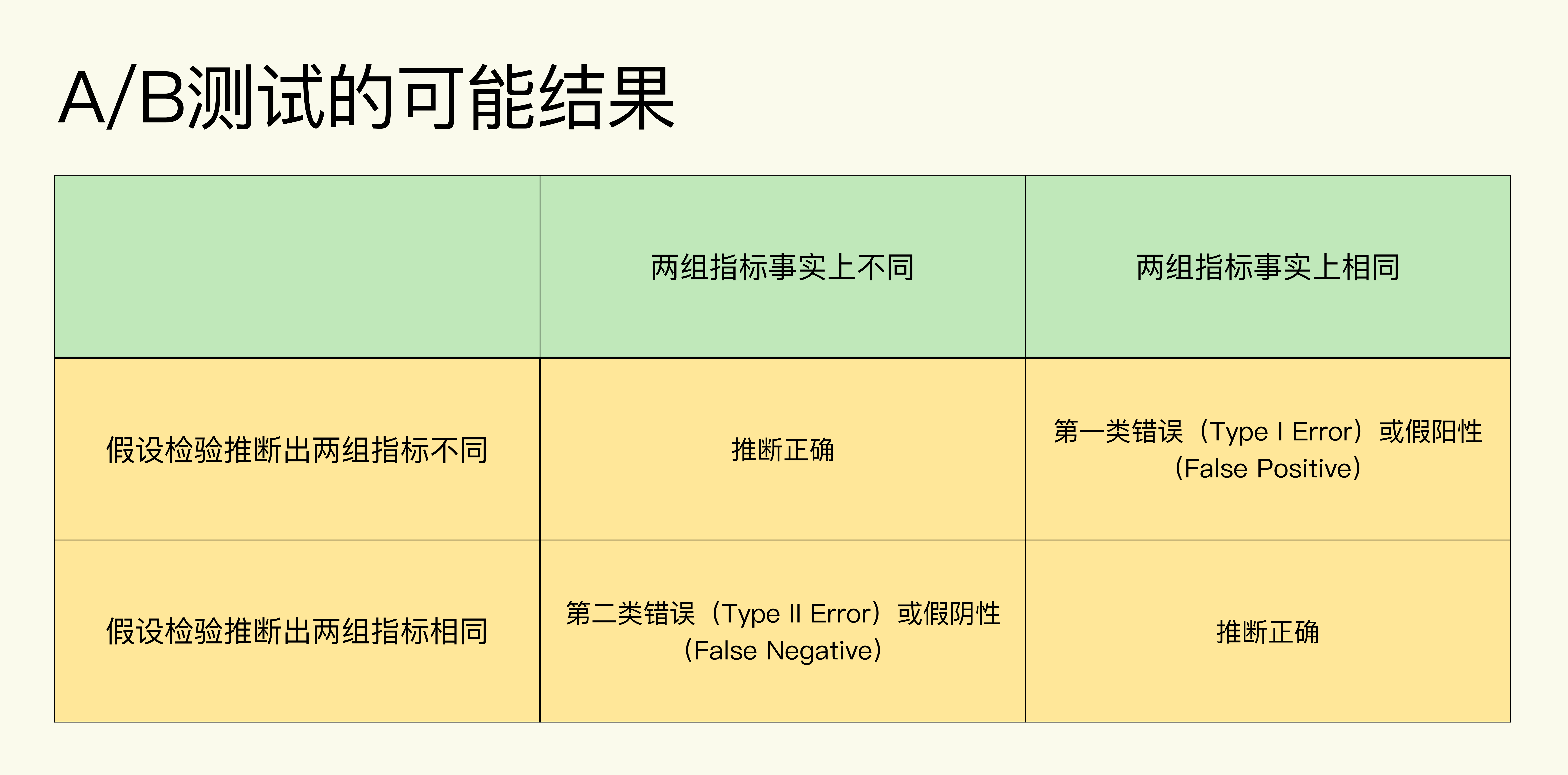 但是请注意,这两个结果只是假设检验根据样本数据,通过一系列统计计算推断出的结果,并不代表事实情况(总体数据情况)。如果考虑到事实情况的话,结合假设检验的推断结果会有四种可能: