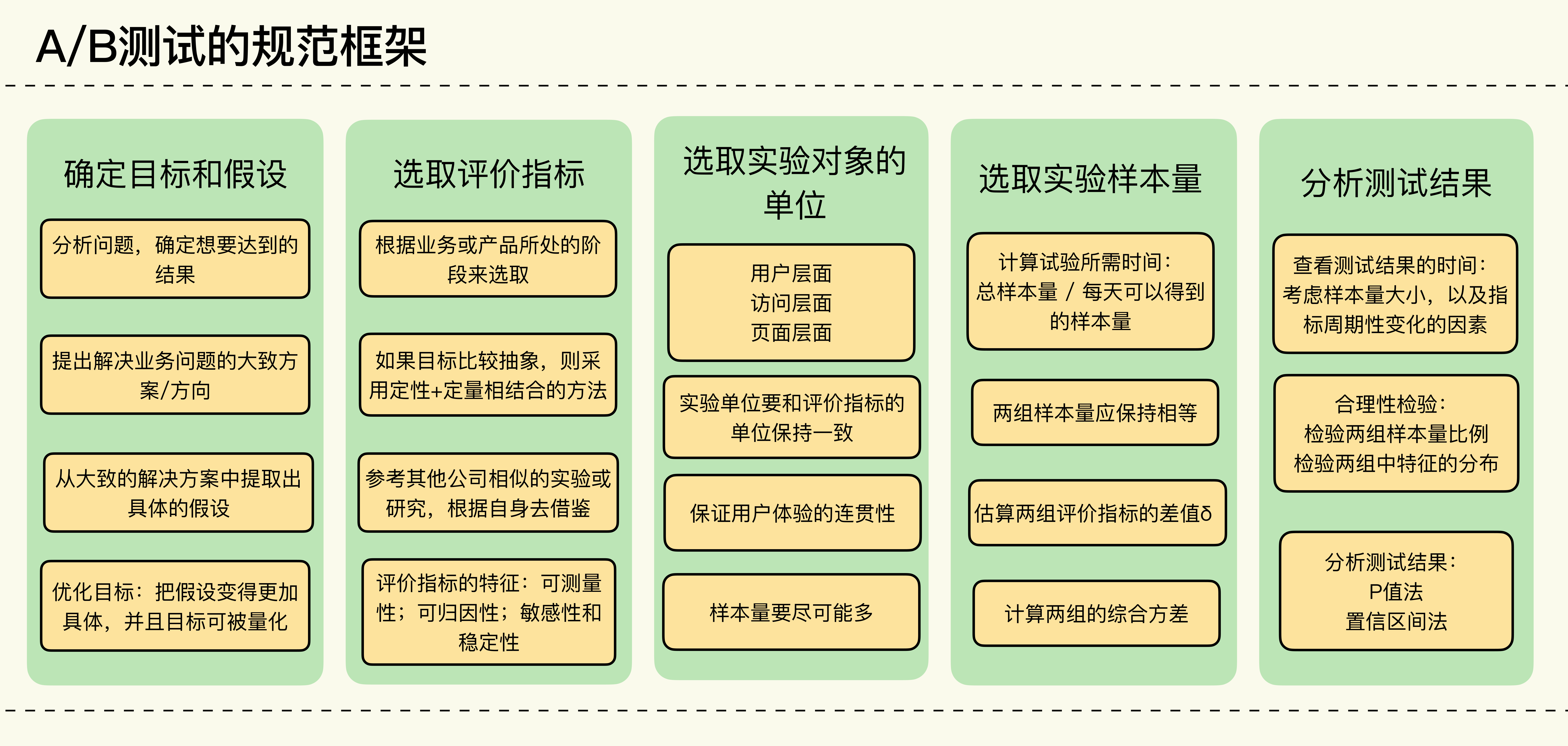 回忆你之前做过或者经历过的A/B测试,它们是否有这些基本的流程步骤?如果缺少的话,是缺少哪些步骤,为什么?如果还有其他步骤,也和我分享一下吧。