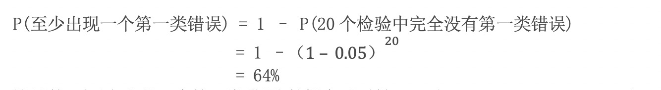 5%看上去是个小概率事件,但是如果我们同时比较20个检验(测试)呢?你可以先思考一下,如果每个检验出现第一类错误的概率是5%,那么在这20个检验中至少出现一个第一类错误的概率是多少呢?
